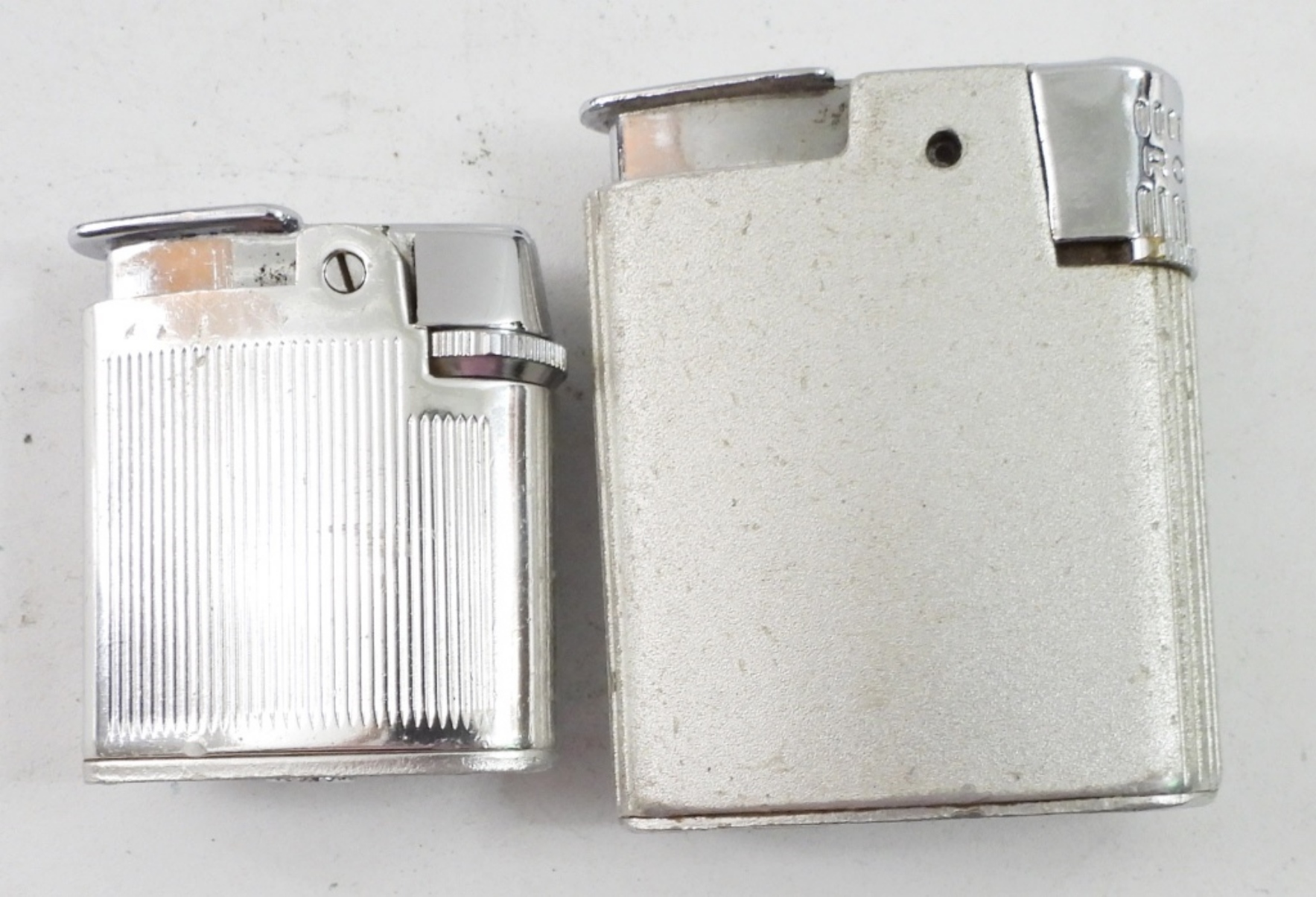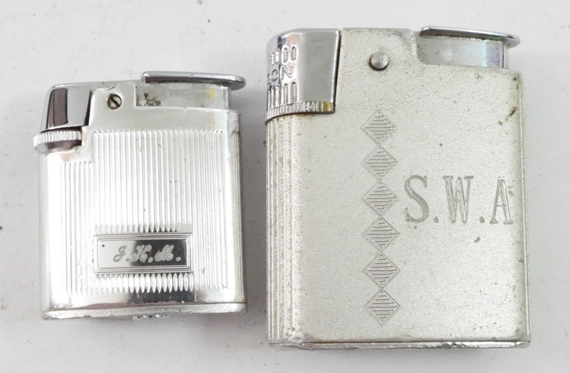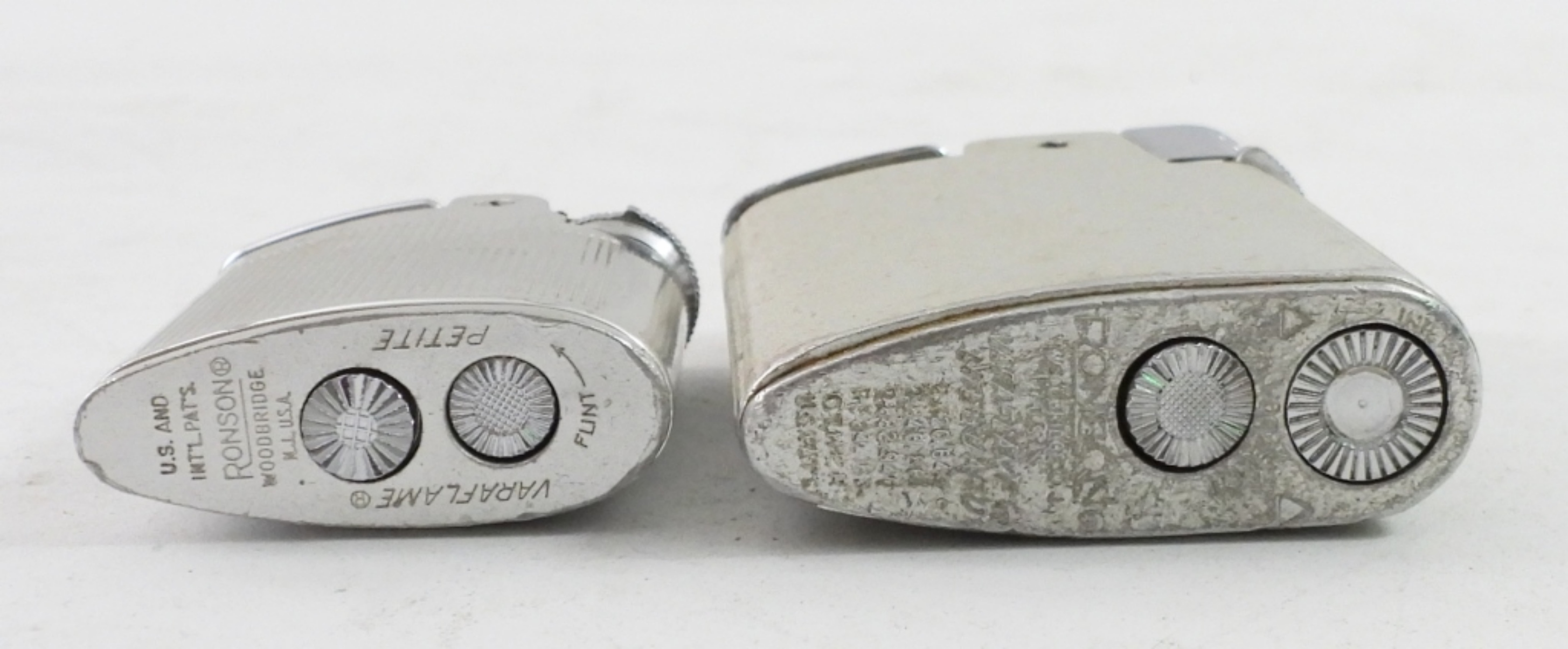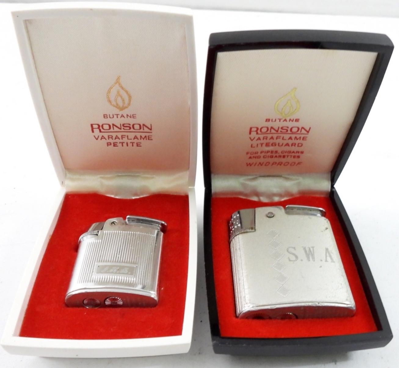 TWO RONSON VARAFLAME LIGHTERS. ONE LITEGUARD & ONE PETITE. BOTH SILVER TONE. BOTH PERSONALIZED. BOTH COME IN ORIGNAL HARD CASES.