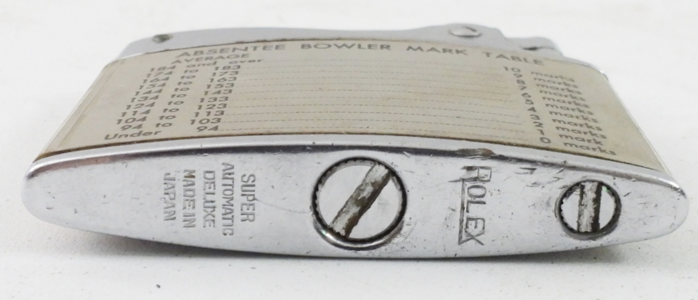VINTAGE ROLEX LIGHTER. HAS KING LOUIE BOWLING LANES ADVERTISEMENT PRINTED ON IT. IN ORIGINAL ROLEX BOX.