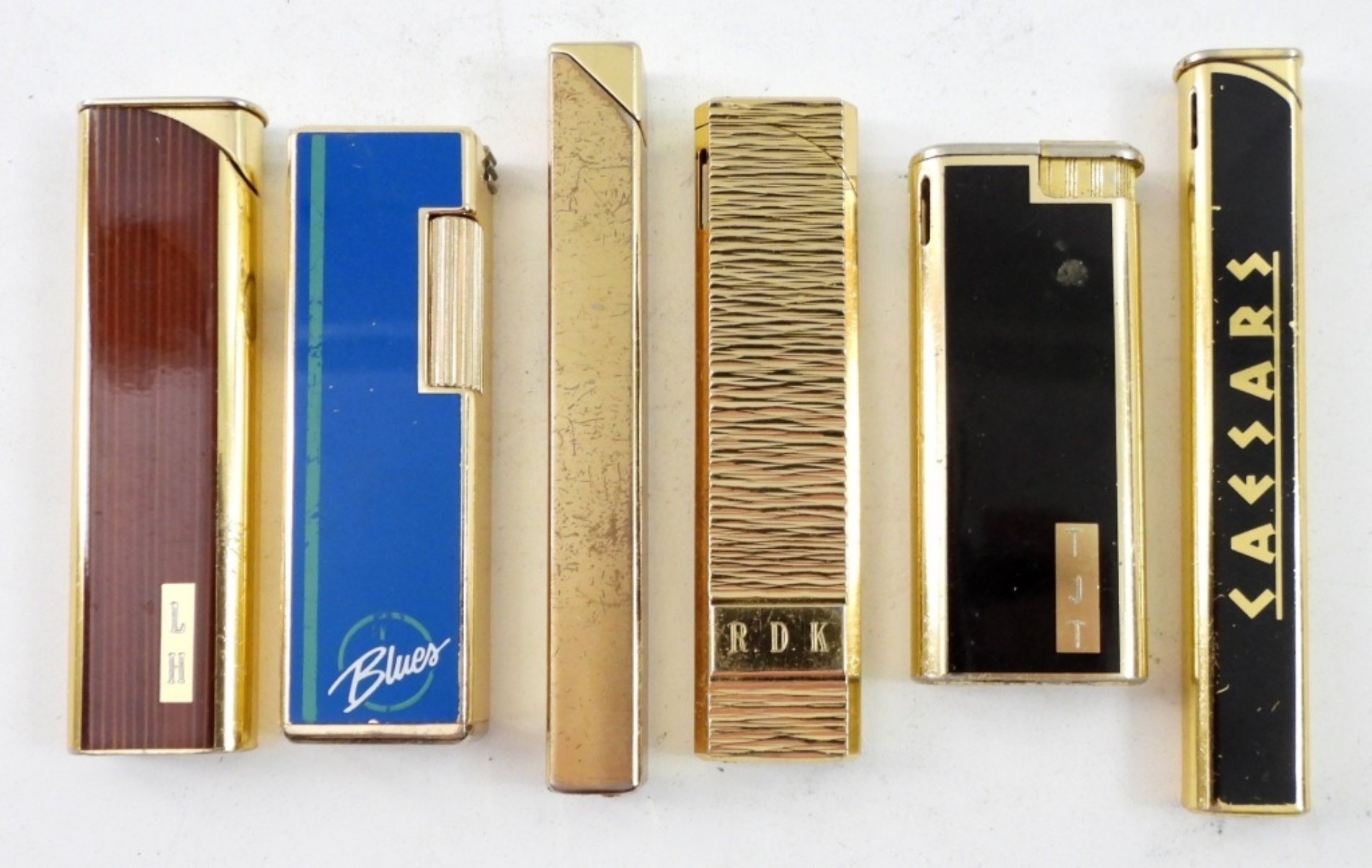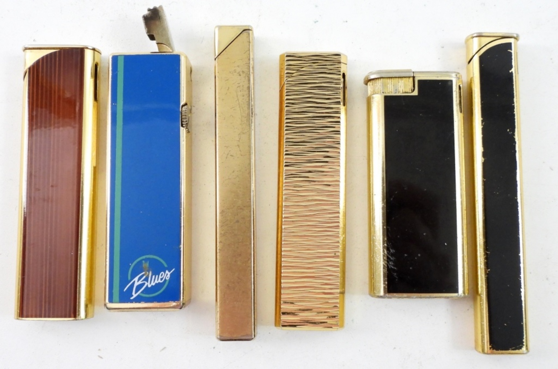 SIX VINTAGE SLIM LIGHTERS. ALL GOLD TONE.