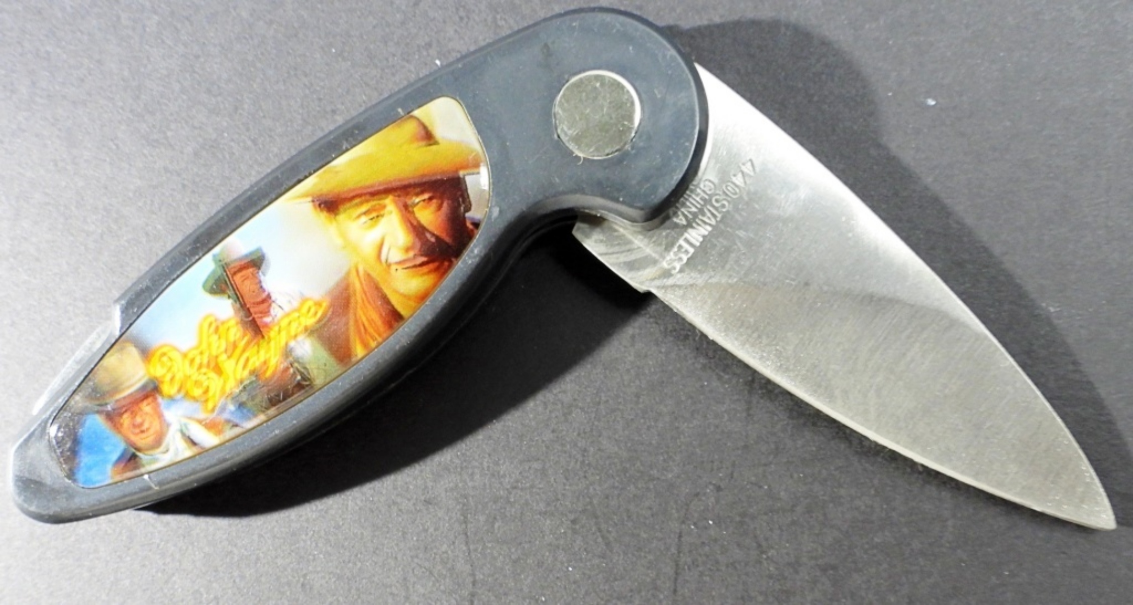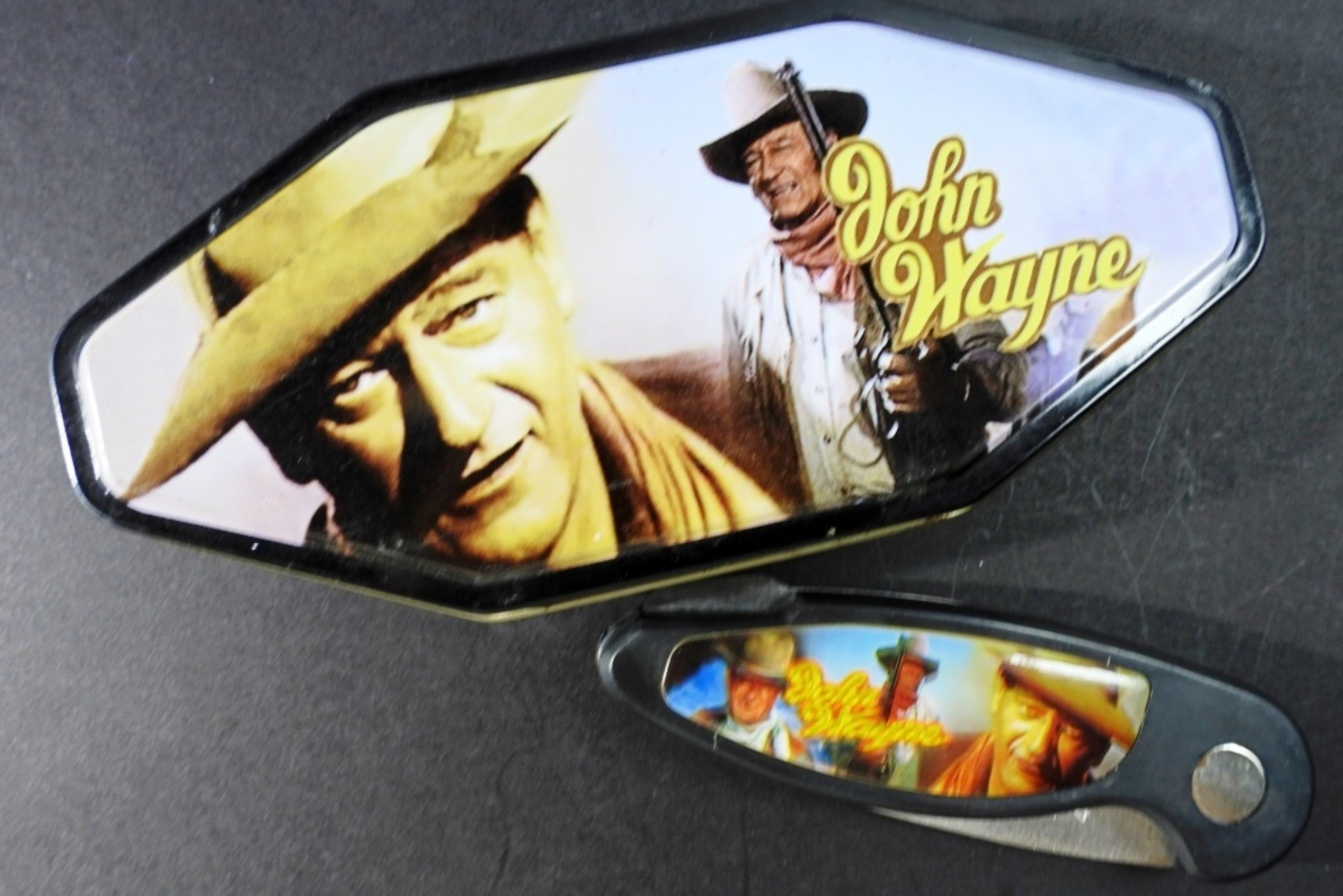 NEVER USED POCKET KNIFE JOHN WAYNE PICTURE ON HANDLE AND WITH ORIGINAL TIN BOX