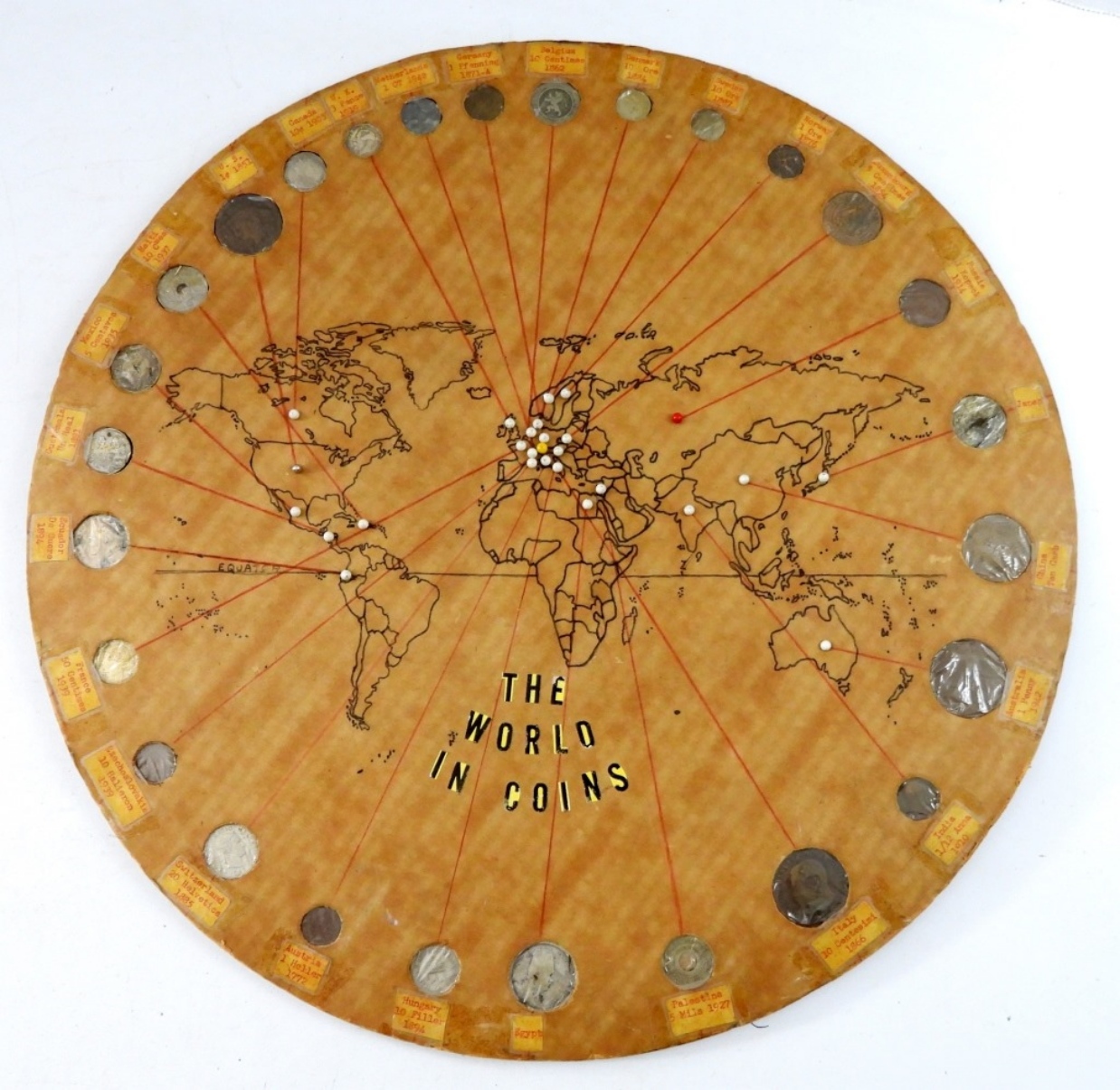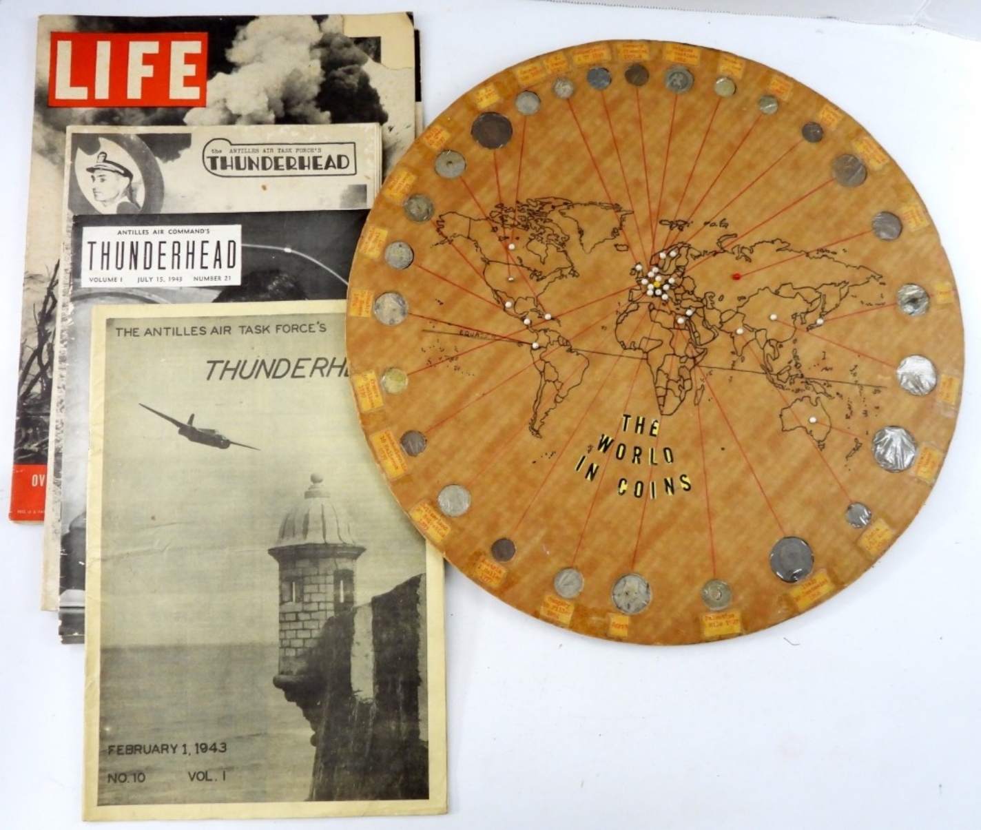 LIFE MAGAZINES & CORK BOARD WORLD COIN WALL HANGING with some FOREIGN COINS