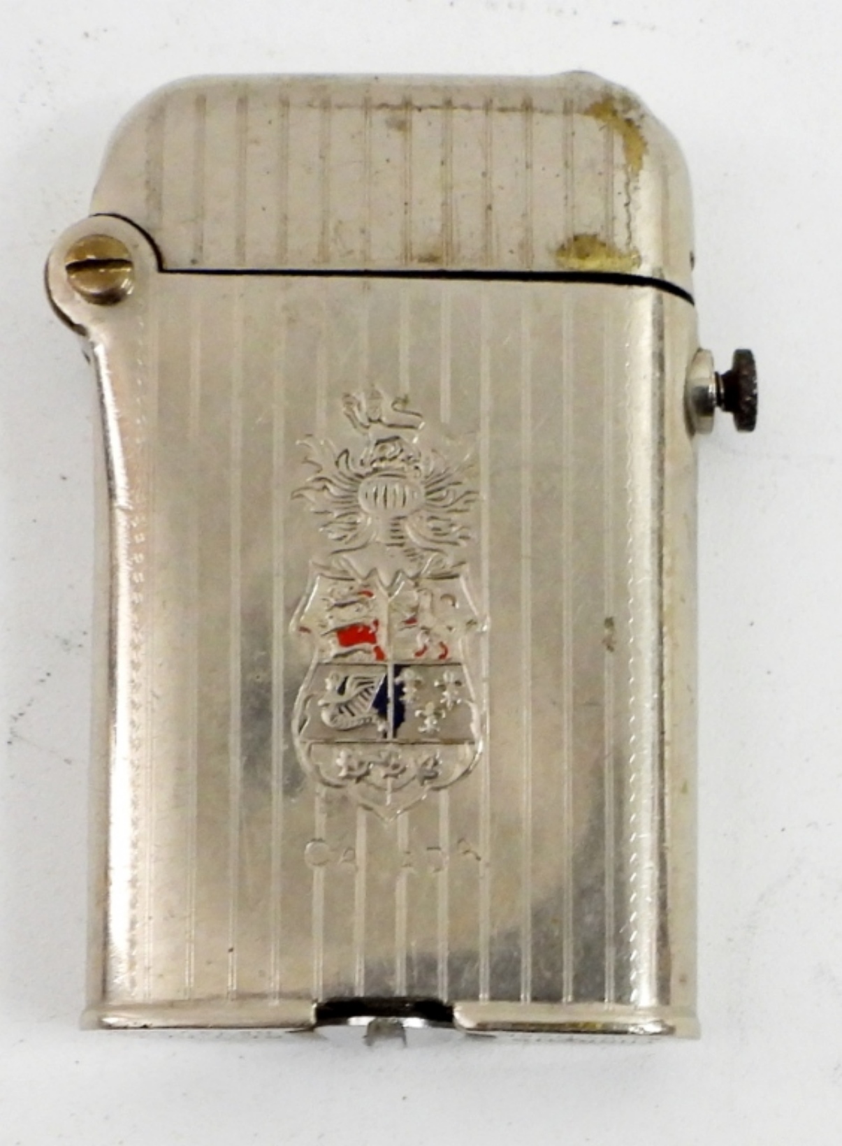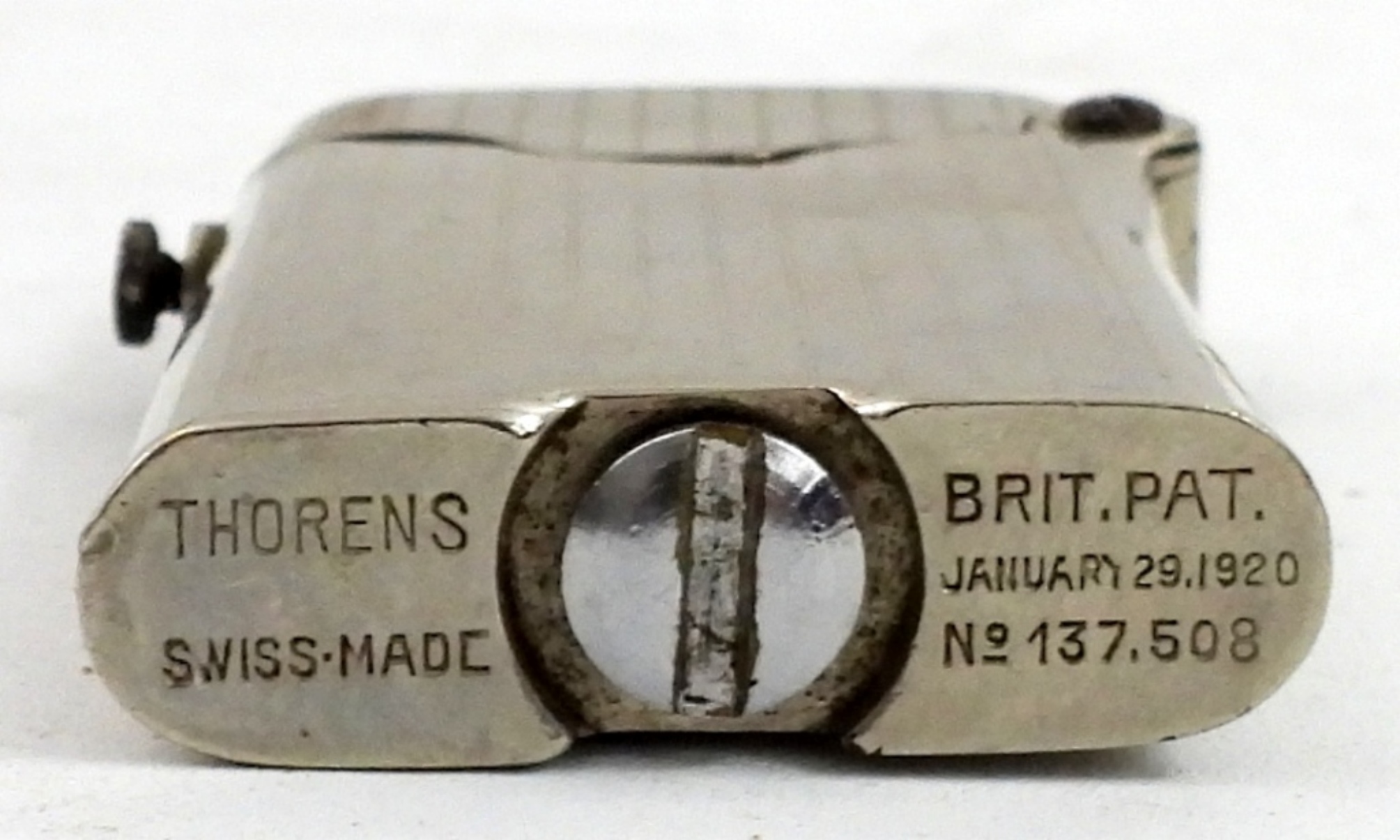 EARLY THORENS PUSH BUTTON LIGHTER, SWISS MADE. “CANADA” ENGRAVED. DATED JANUARY 29, 1920.