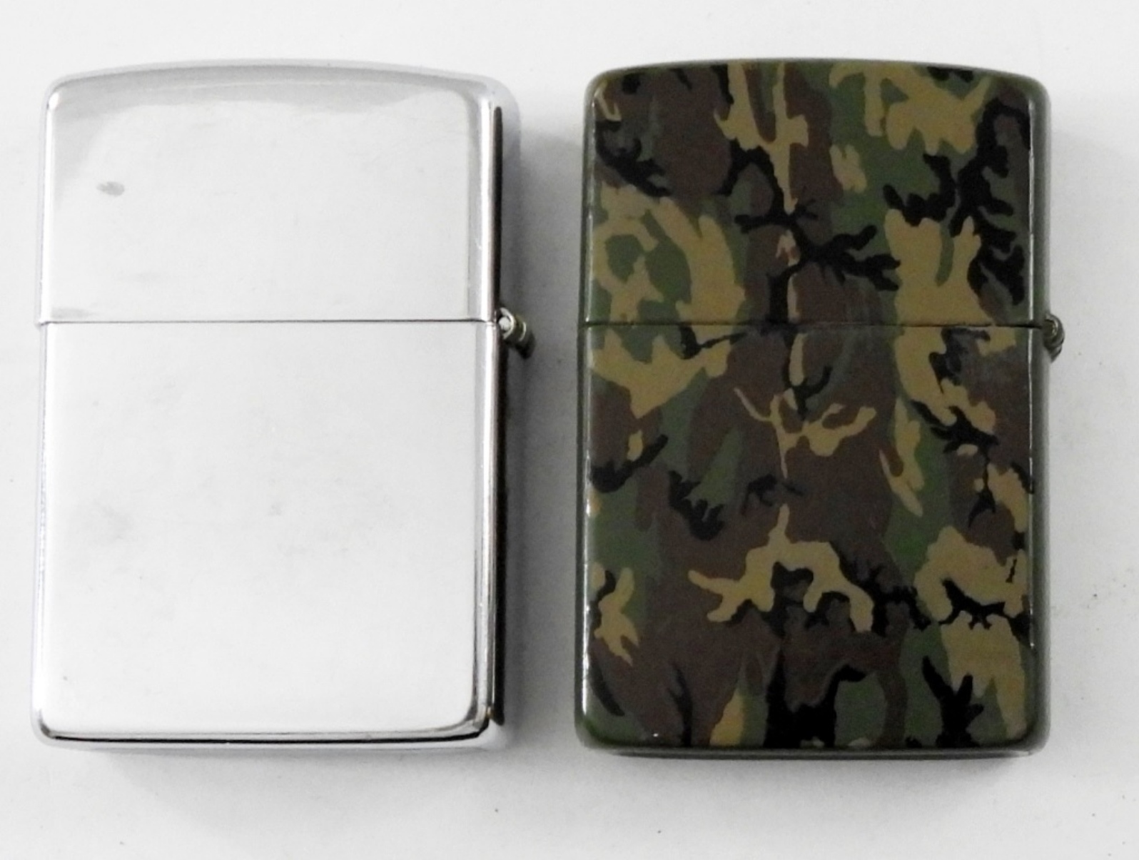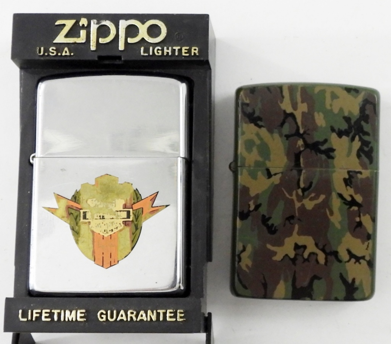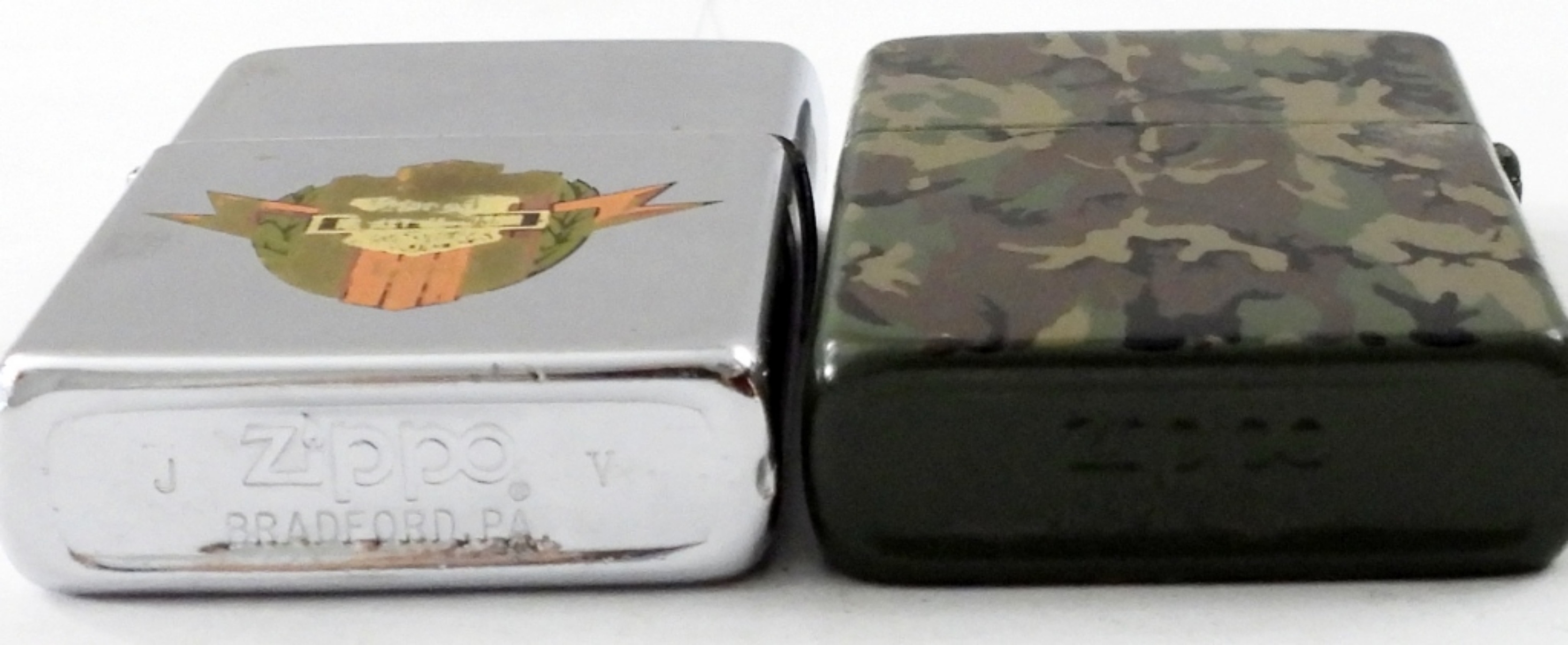 1977 VINTAGE CAMO ZIPPO, FIRED. 1989 ZIPPO WITH LOGO,FIRED .IN ZIPPO CASE