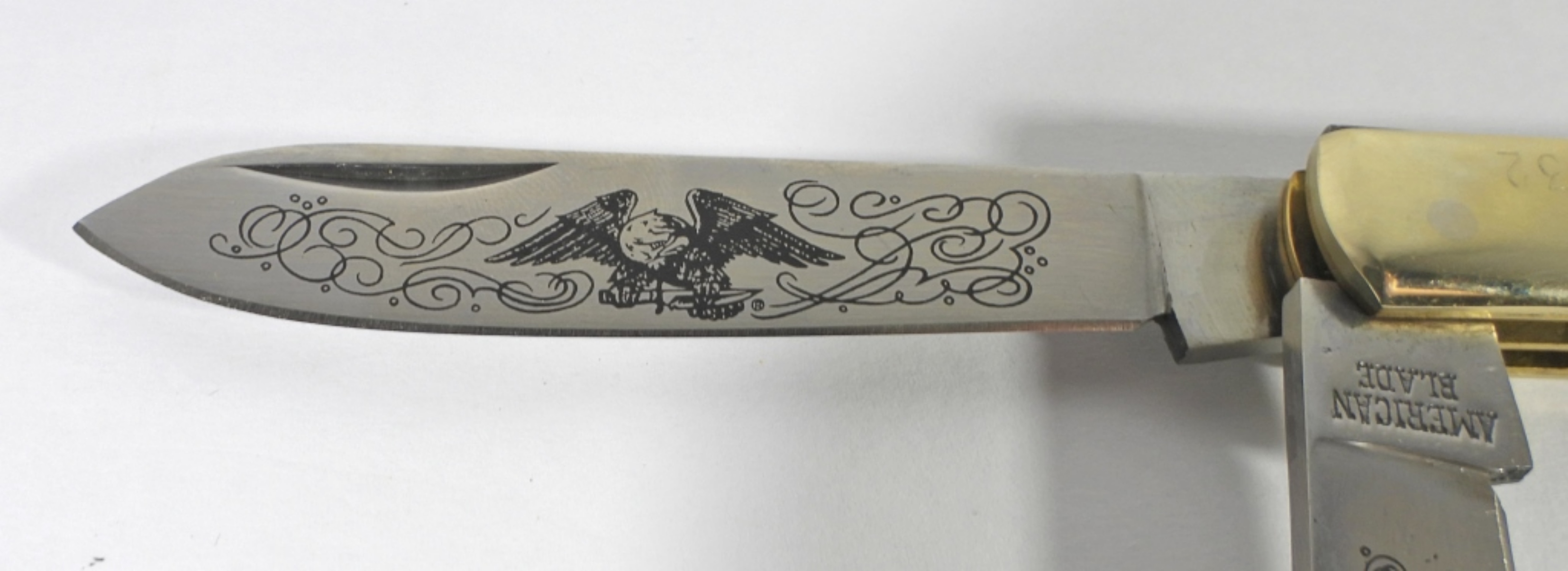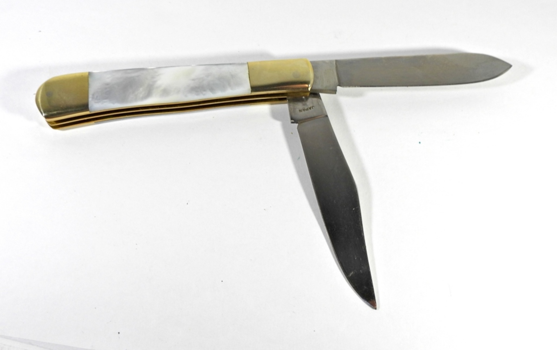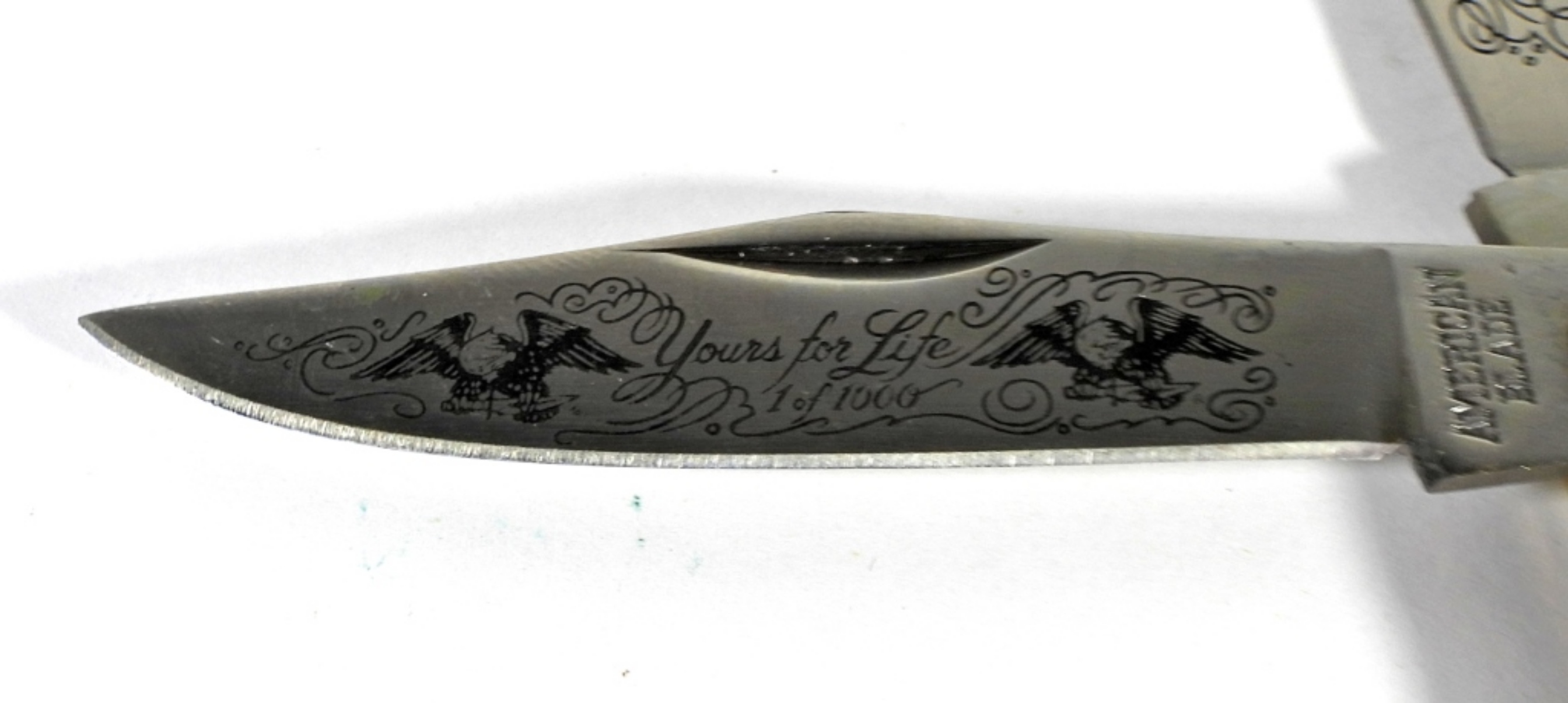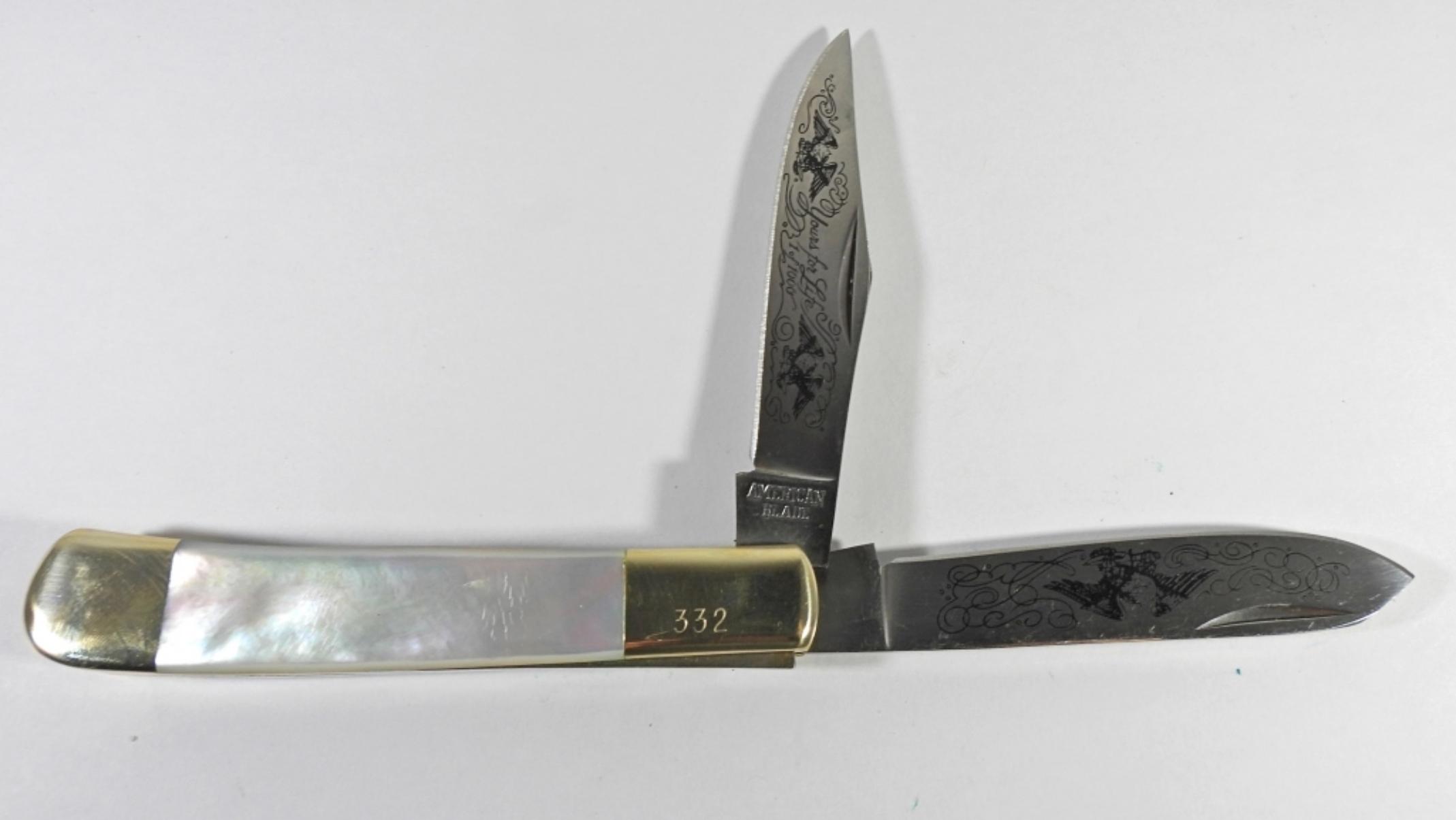 AMERICAN BLADE- PARKER “YOURS FOR LIFE” TRAPPER KNIFE WITH PEARL HANDLE GOOD CONDITION