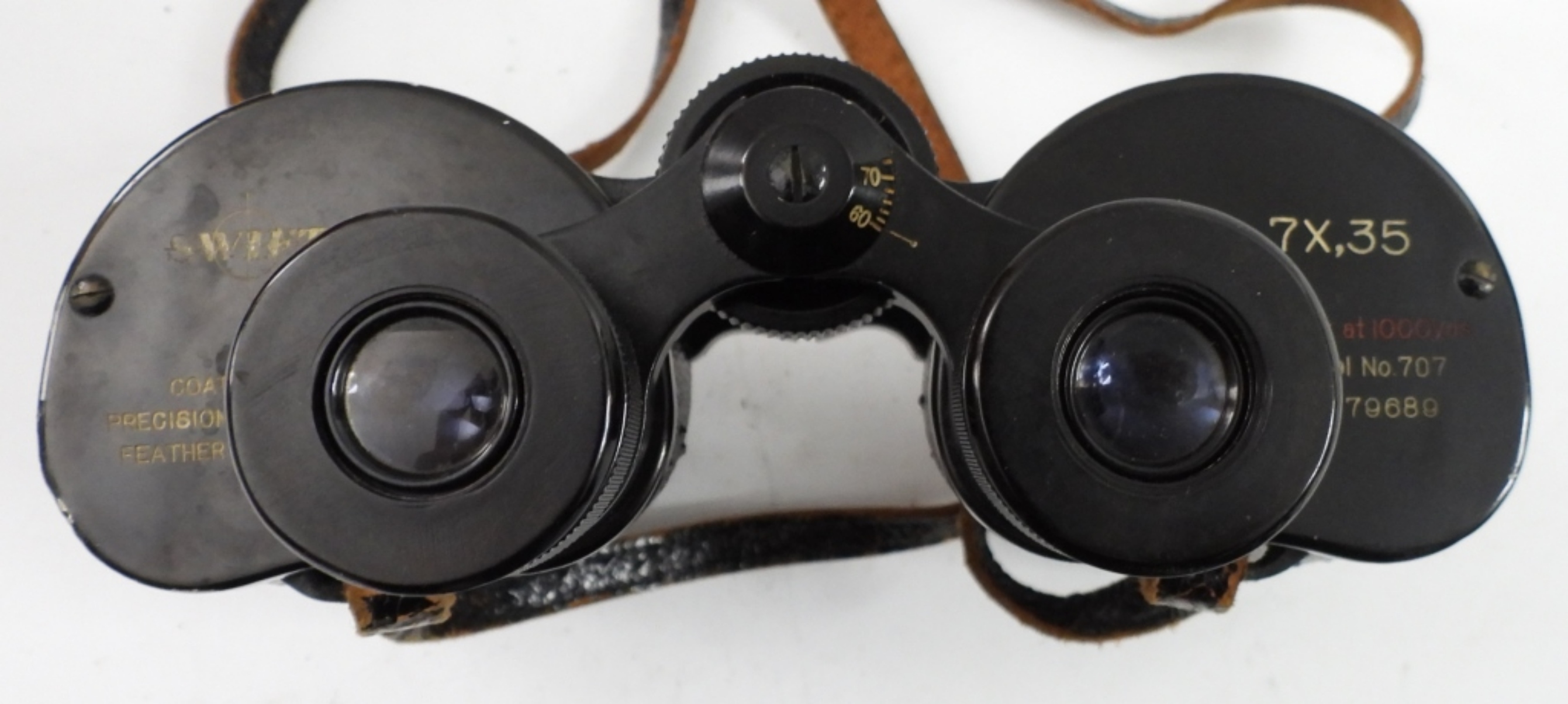 VINTAGE SWIFT BINOCULARS, MODEL # 707, NO.79689, 7X,35. COATED PRECISION OPTICS-FEATHERWEIGHT. COMES IN A LEATHER CASE LINE WITH VELVETEEN.
