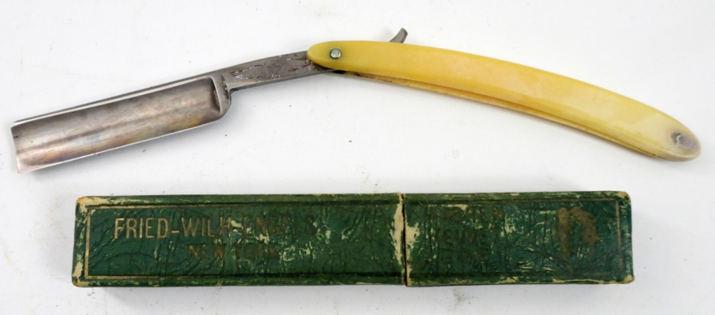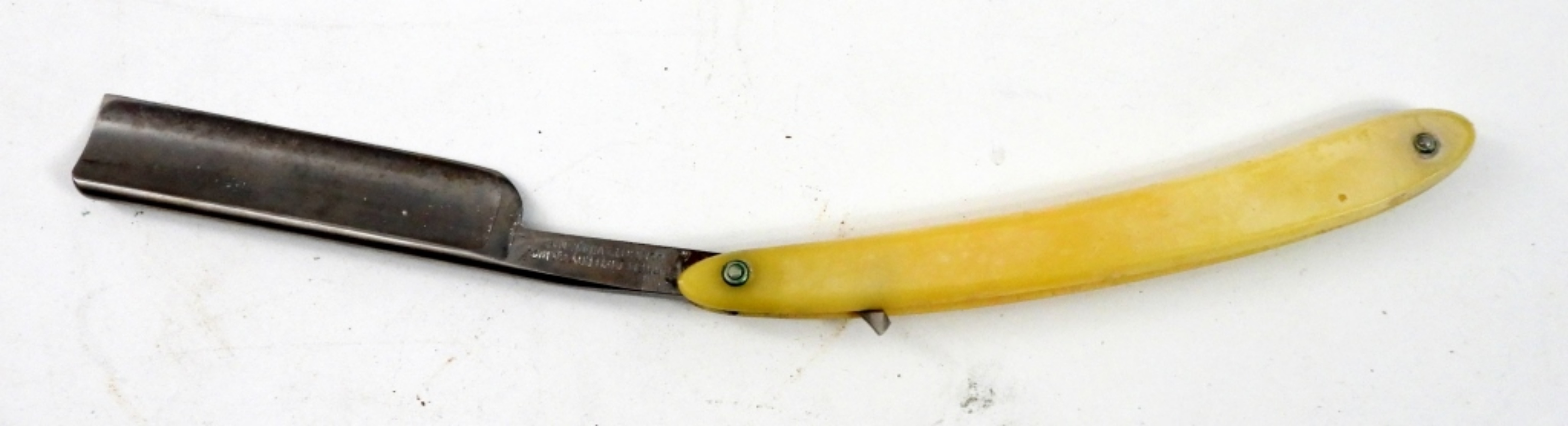 BURRELL CUTLERY “TOP FLIGHT” CELLULOID HANDLED-STRAIGHT RAZOR. ELLICOTVILLE NY.