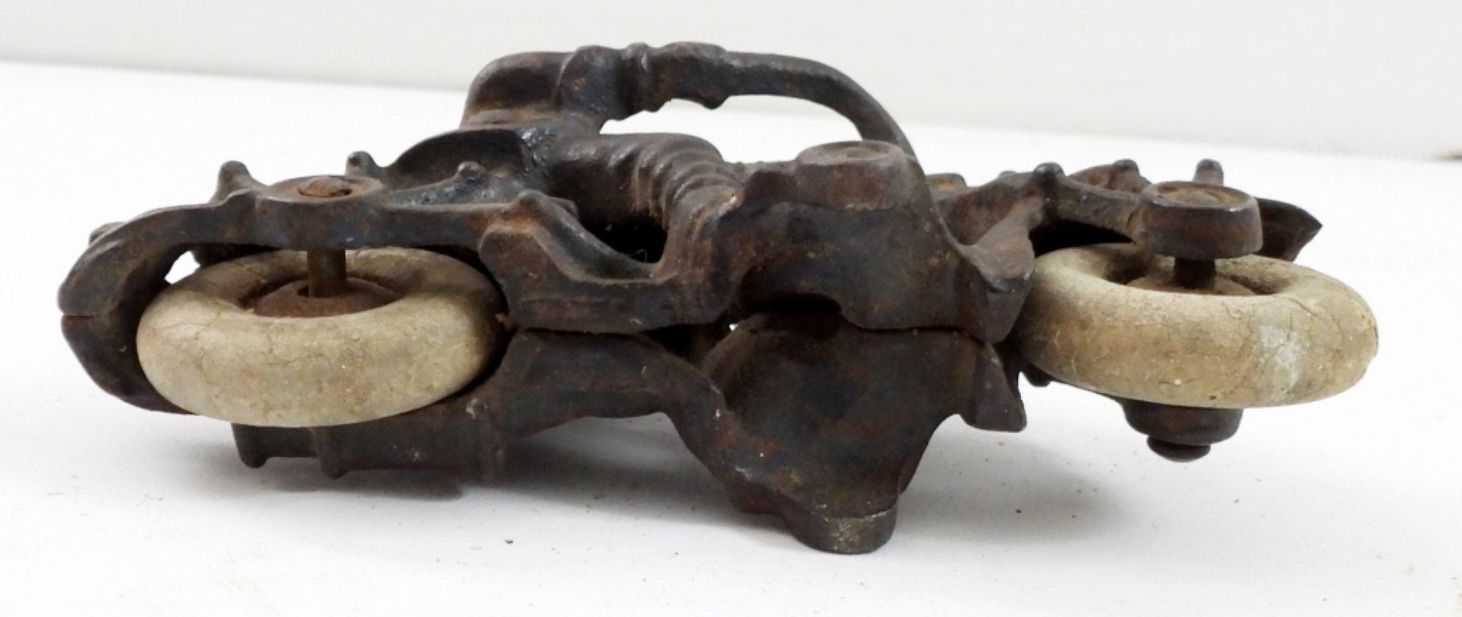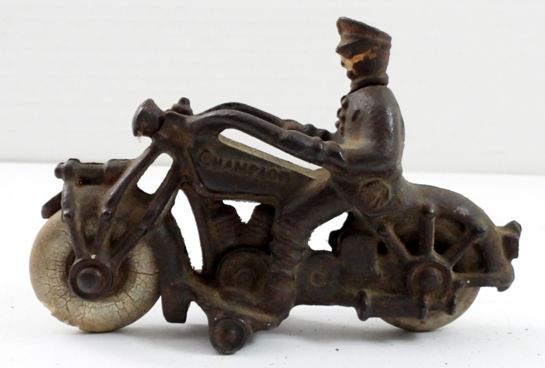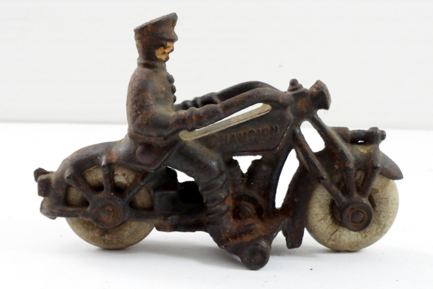 ANTQUE CAST IRON 1930’s POLICE MOTORCYCLE-CHAMPION-HUBLEY RUBBER TIRES (TIRES ARE NOW HARD). 5″ LONG, 4″ TALL.