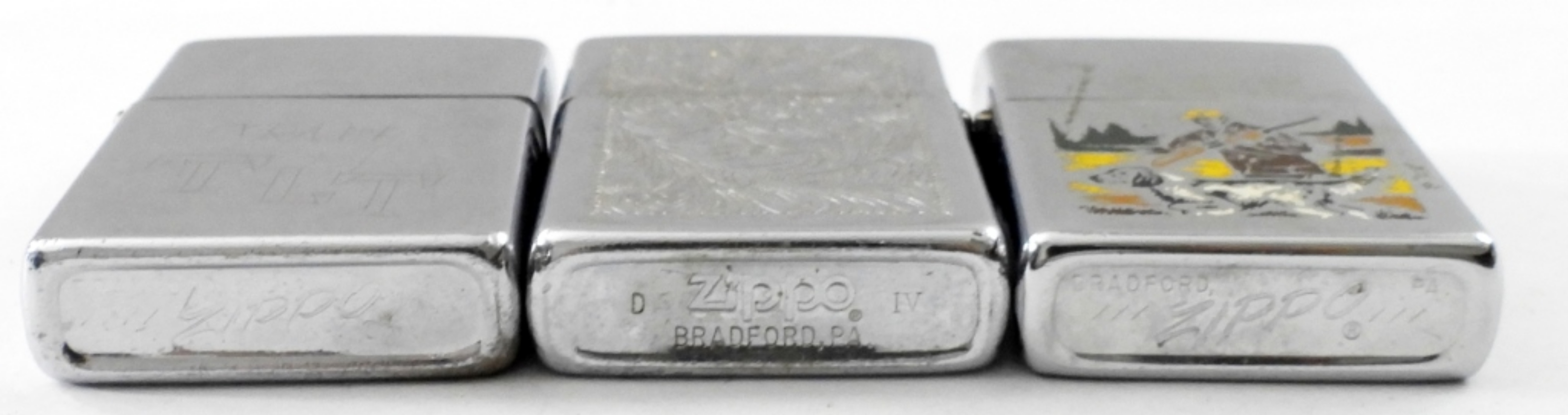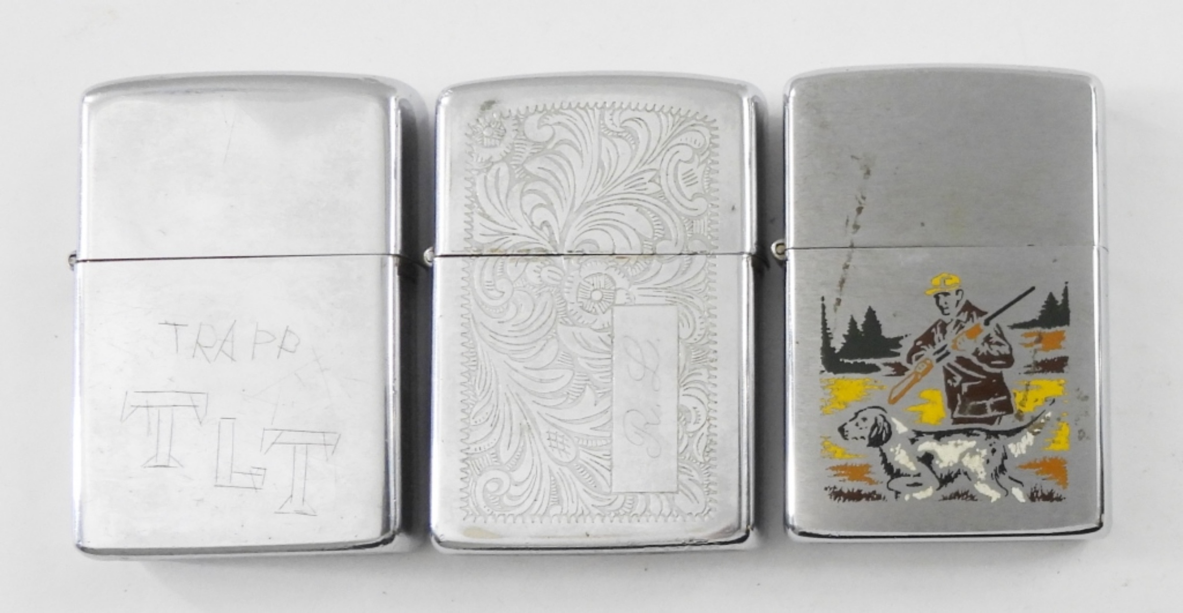 1976 ENGRAVED WITH A HUNTER & DOG ZIPPO LIGHTER ,FIRED. 1975 ENGRAVED ZIPPO, FIRED. 1988 ENGRAVED ZIPPO LIGHTER,FIRED