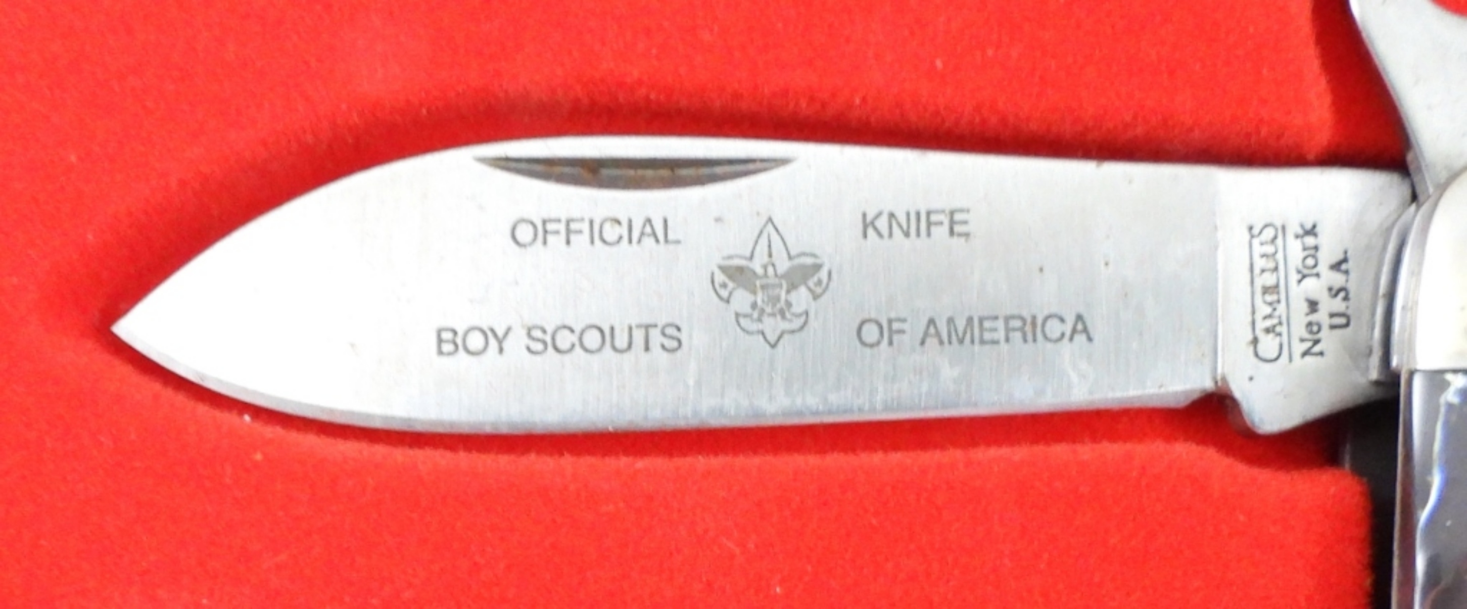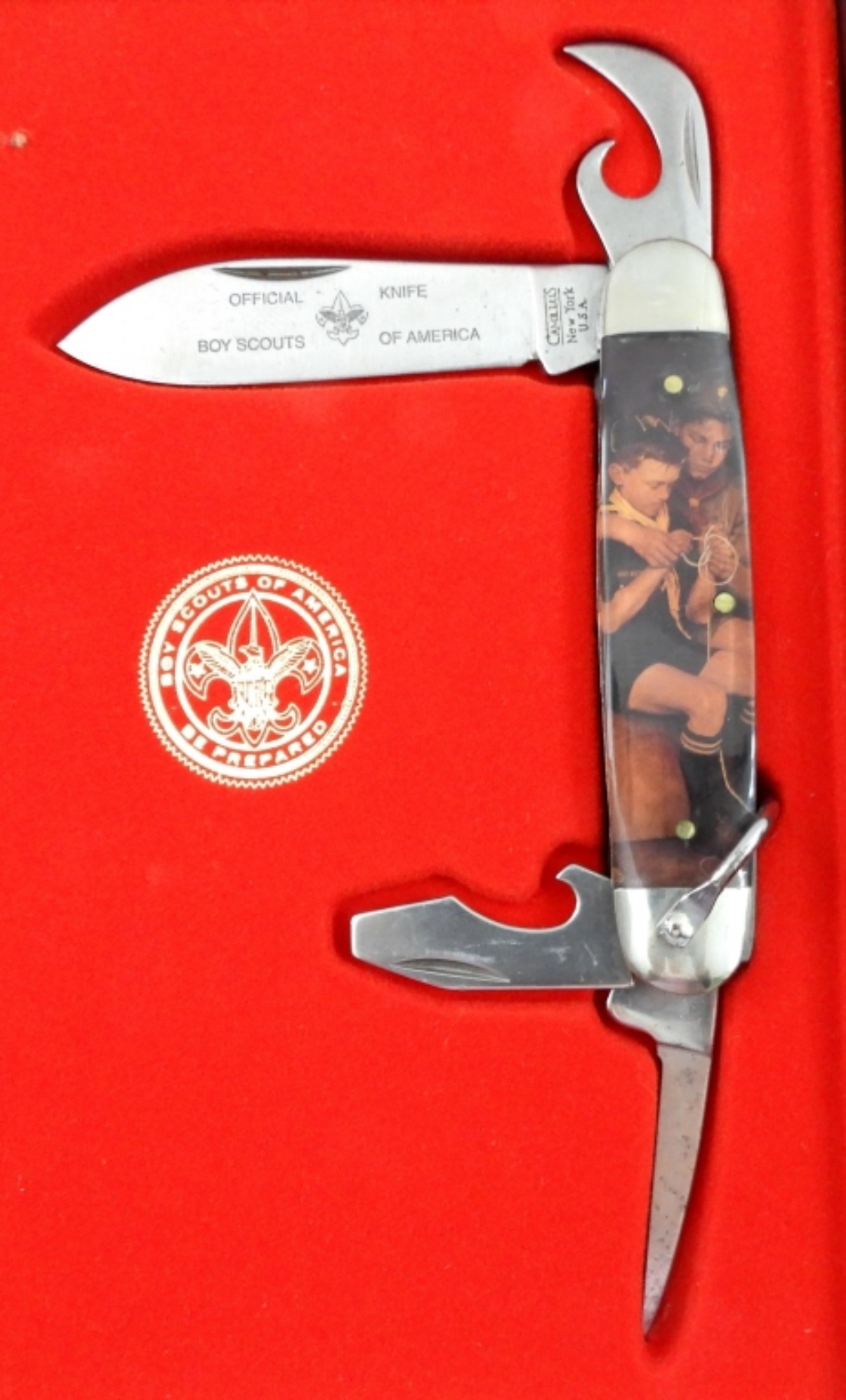 LIMITED EDITION BOY SCOUTS OF AMERICA, NORMAN ROCKWELL COMMEMORATIVE KNIFE. 4″ CLOSED. BLADE IS 3″. IN ORIGINAL BOX WITH ORIGINAL PAPERWORK.