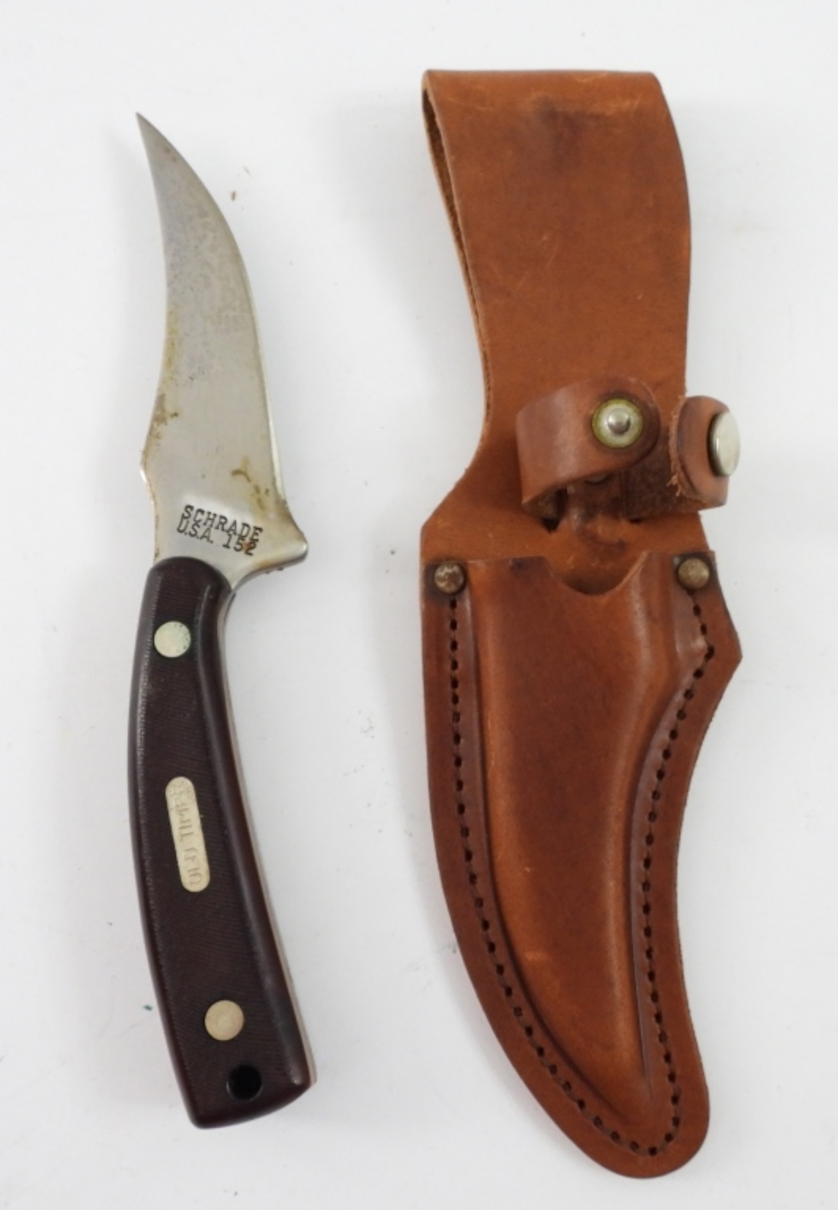 SCHRADE USA 152 OLD TIMER SHARPFINGER KNIFE WITH BROWN LEATHER SHEATH. 7″.