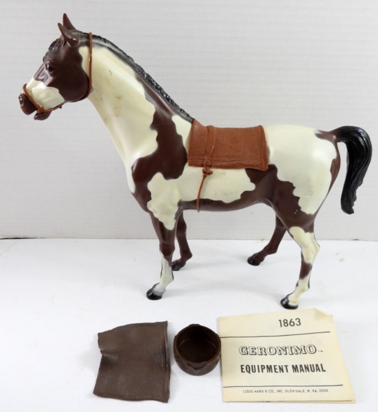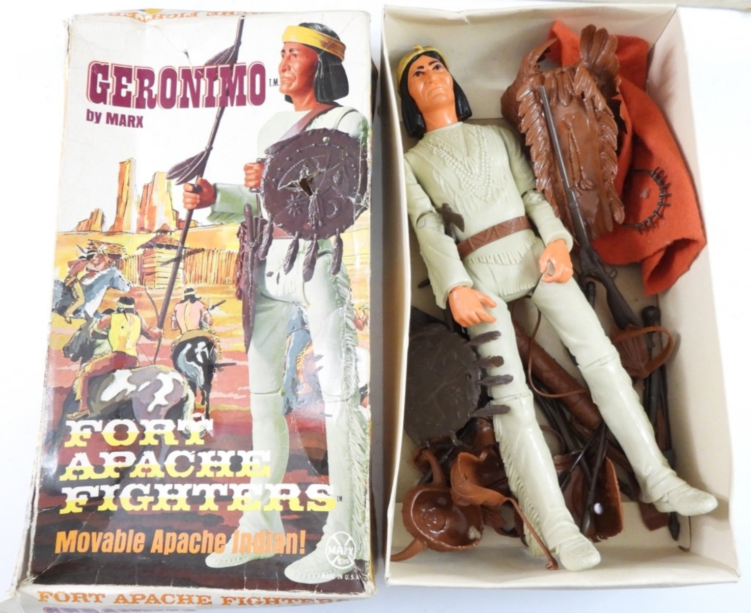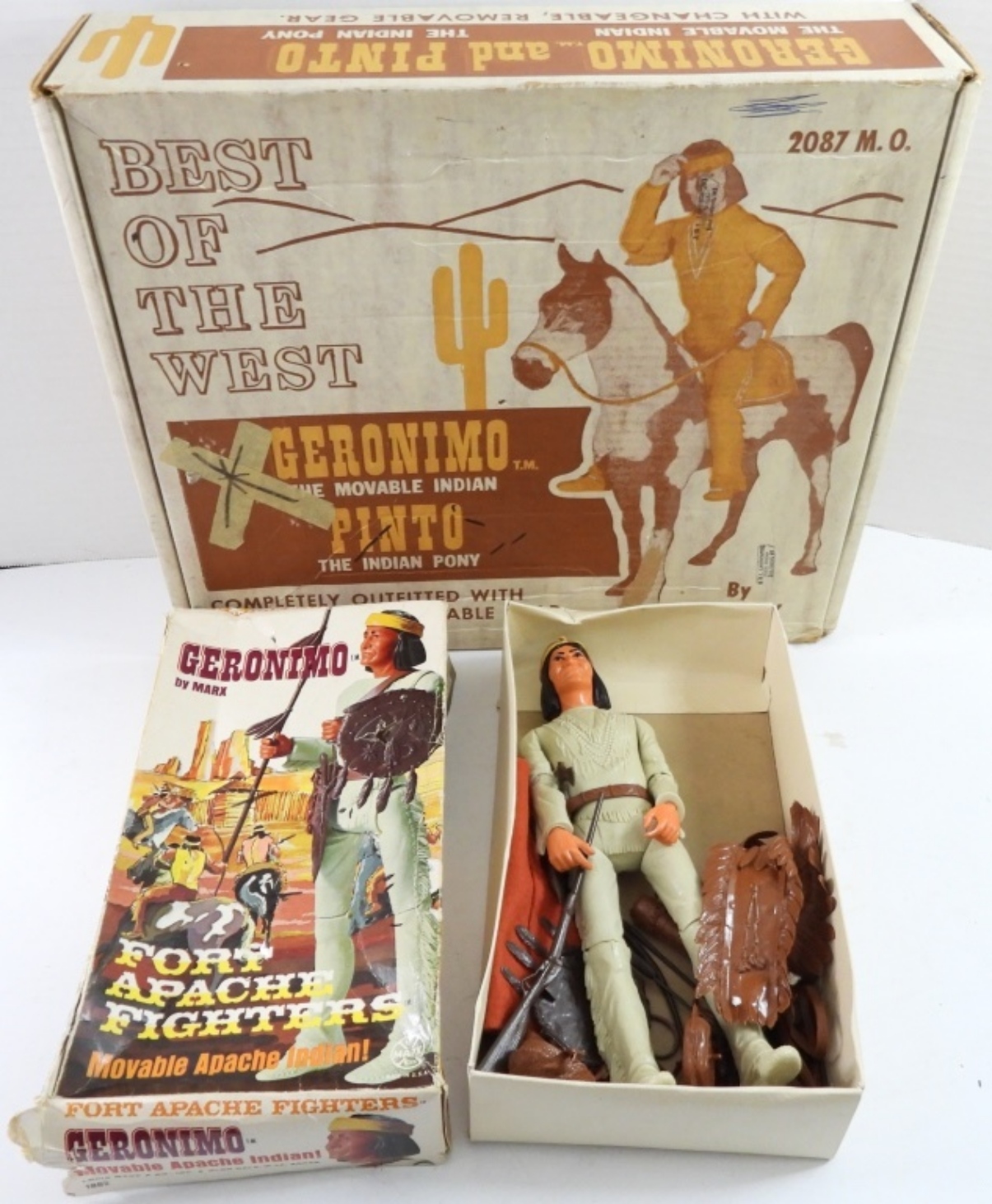 VINTAGE 1965 MARX BEST OF THE WEST PINTO, THE INDIAN PONY( MCMLXV) IN ORIGINAL BOX. 1967 GERONIMO FORT APACHE FIGHTERS MOVABLE APACHE INDIAN WITH ACCESSORIES IN ORIGINAL BOX