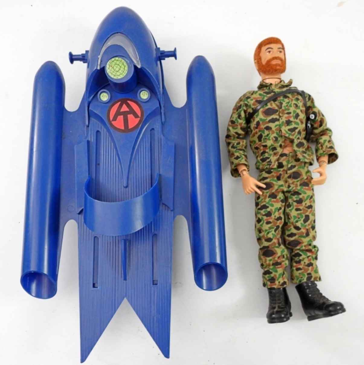 VINTAGE 1964 GI JOE WITH RED LIFE LIKE HAIR AND BEARD AND GI JOE SEA ADVENTURES BLUE SEA SLED IN ORIGINAL BOX