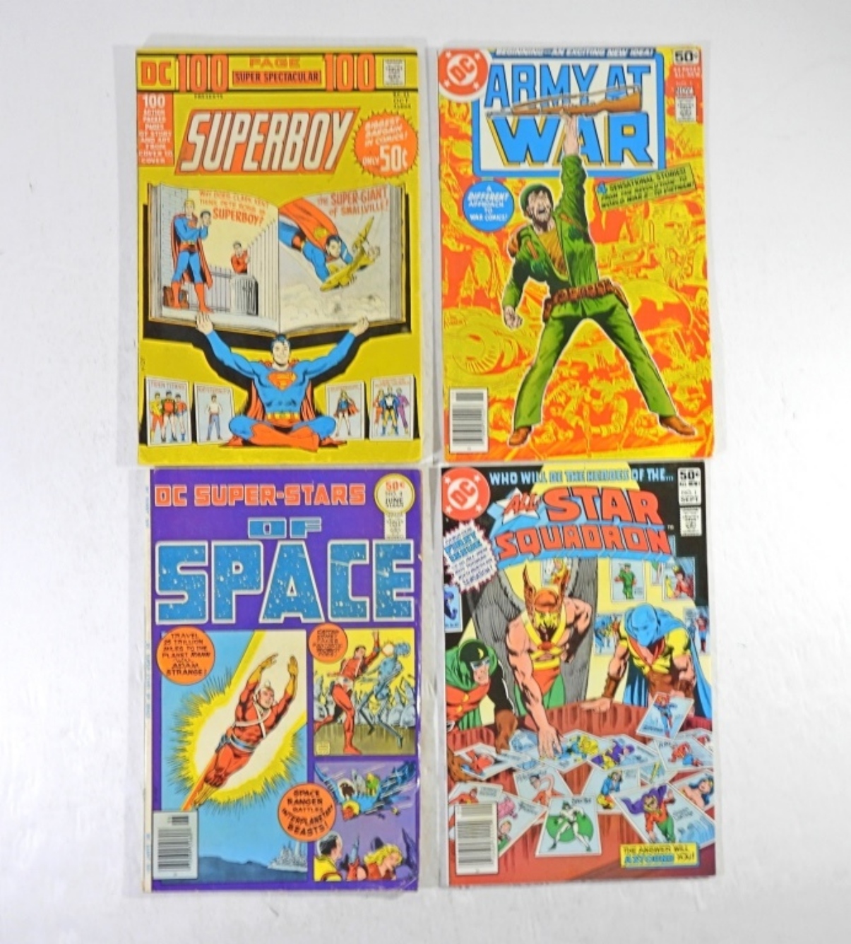 4 50c DC COMICS ALL-STAR SQUADRON #1, ARMY AT WAR #1, DC 100 PAGE SPECTACULAR SUPERBOY, DC SUPER-STARS OF SPACE #4. ALL IN GOOD CONDITION