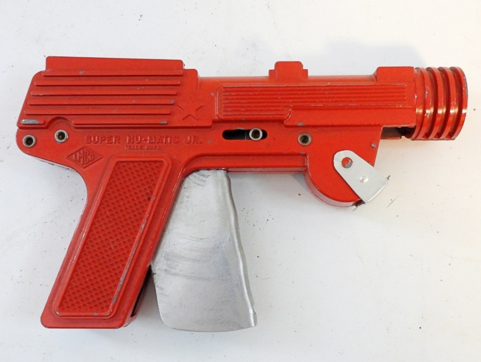 VINTAGE RED LMCO SUPER NU-MATIC JR. CAP GUN WITH 4 ROLLS OF POPPERS