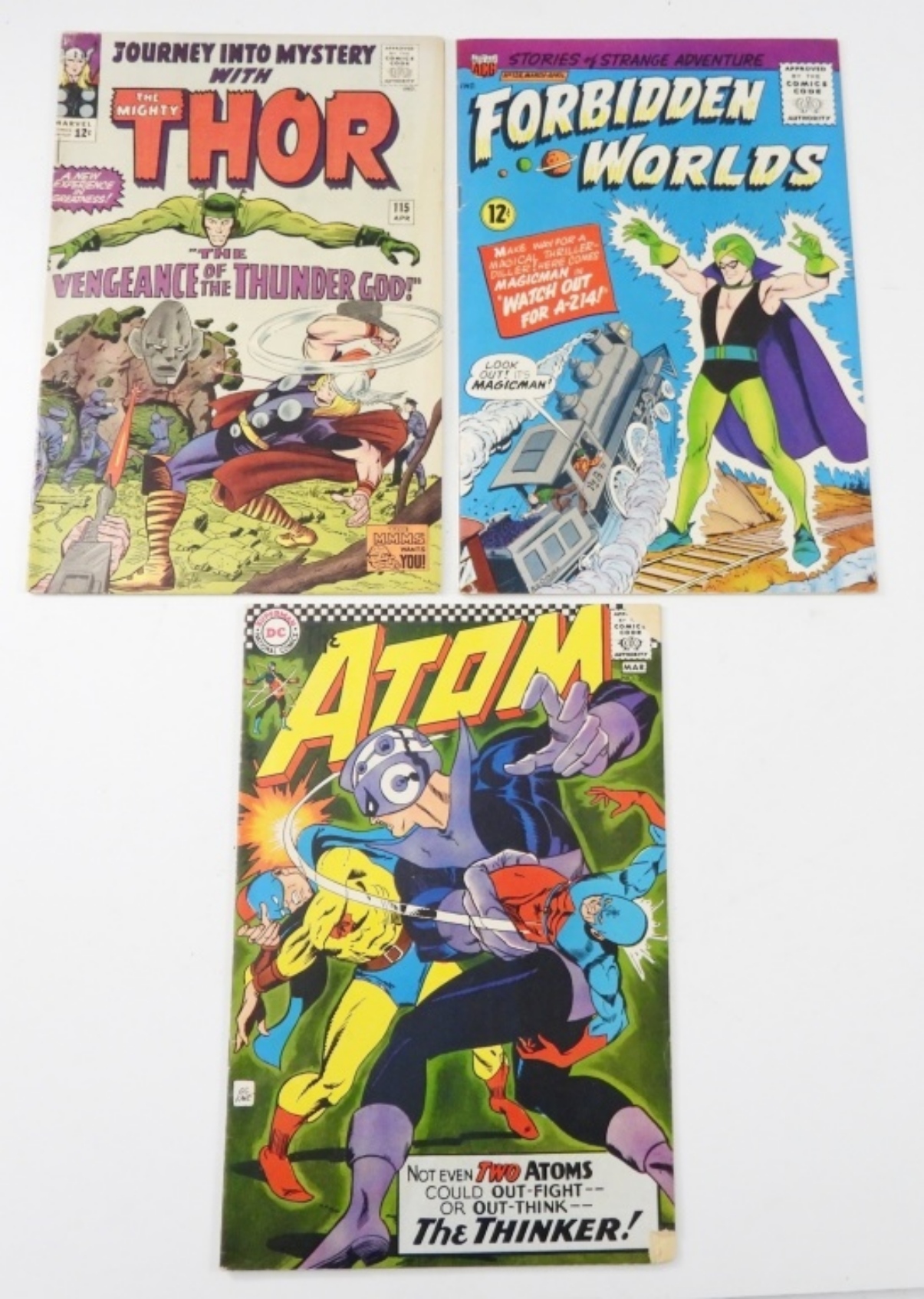 MARVEL JOURNEY INTO MYSTERY WITH THE MIGHTY THOR-APR1965 #115 (FINE). ACG FORBIDDEN WORLDS WITH MAGICMAN-1965 #126 (VF+). DC ATOM -MARCH 1967 #29, CROSSOVER (GOOD).