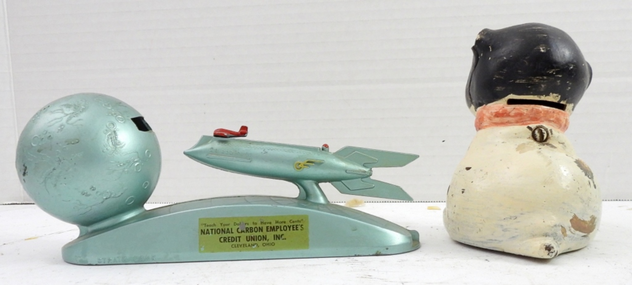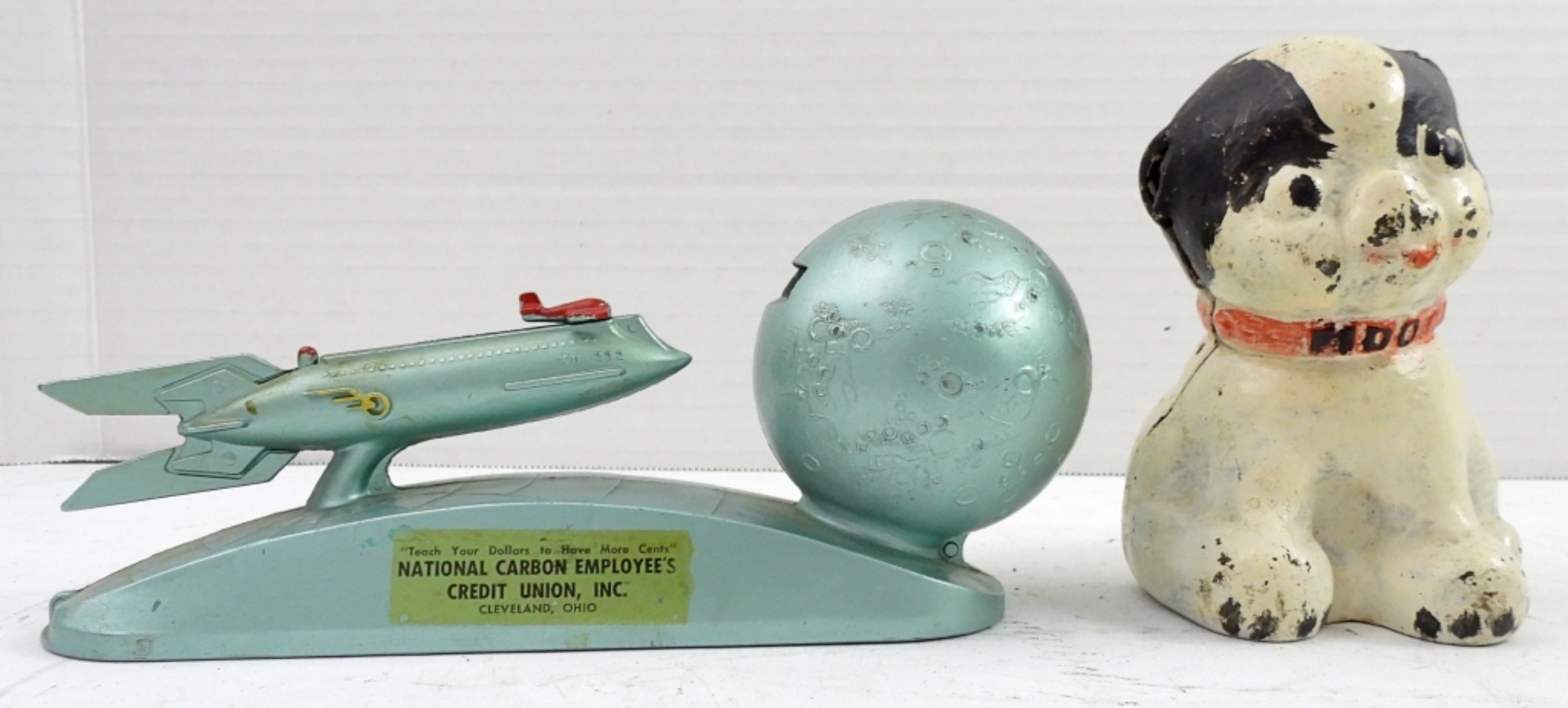 NATIONAL CARBON EMPLOYEE’S CREDIT UNION CLEVELAND OHIO BANK WORKING CONDITION – 5″ TALL FIDO DOG BANK ORIGINAL HUBLEY STYLE – missing Ears