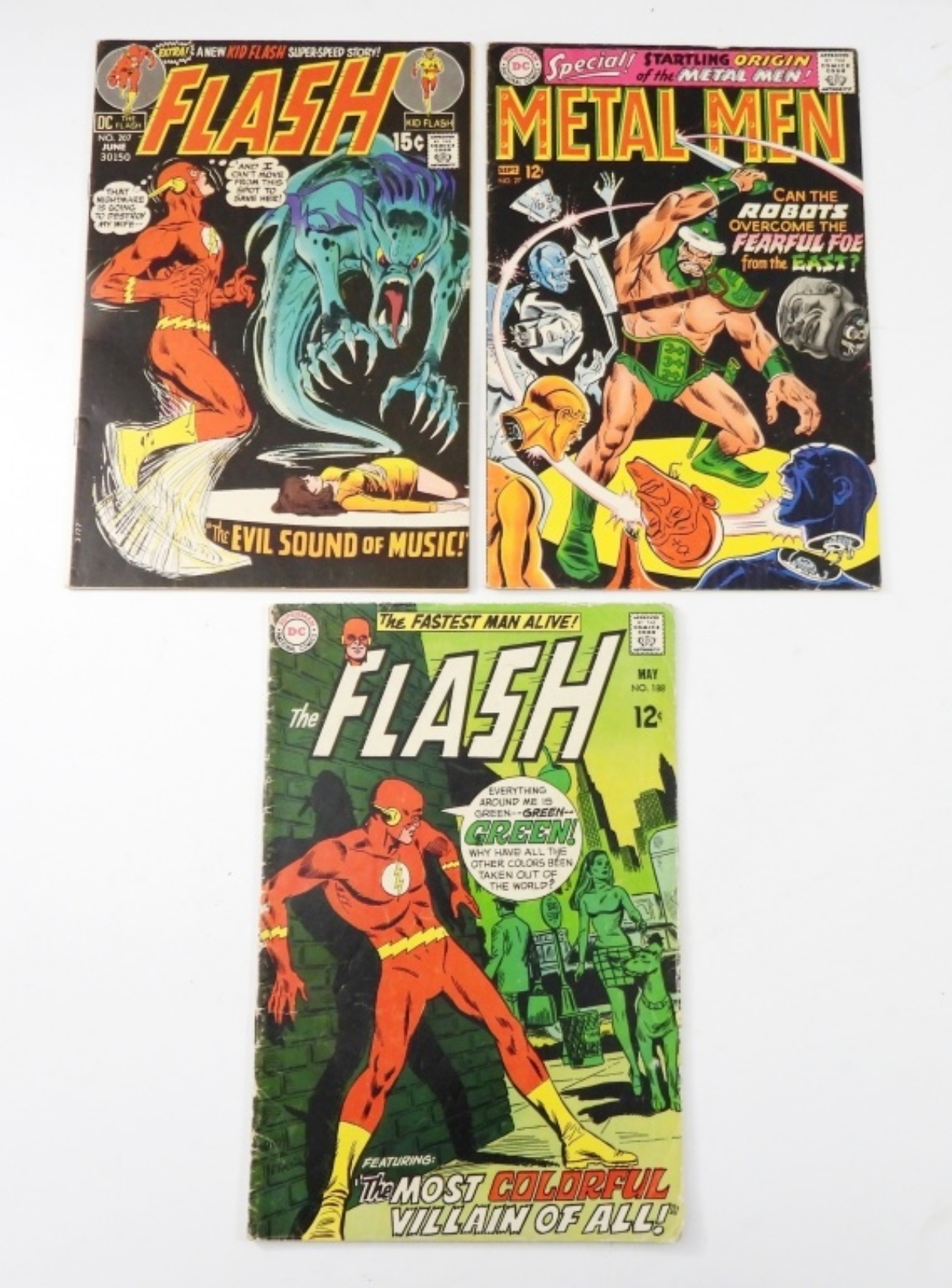 DC THE FLASH 1969 #188 “THE MOST COLORFUL VILLAIN OF ALL”-POOR (SEVERAL CUT PAGES). THE FLASH 1971 #207 “THE EVIL SOUND OF MUSIC”-VF. METAL MEN 1967 #27-METAL MEN ORIGIN-F.