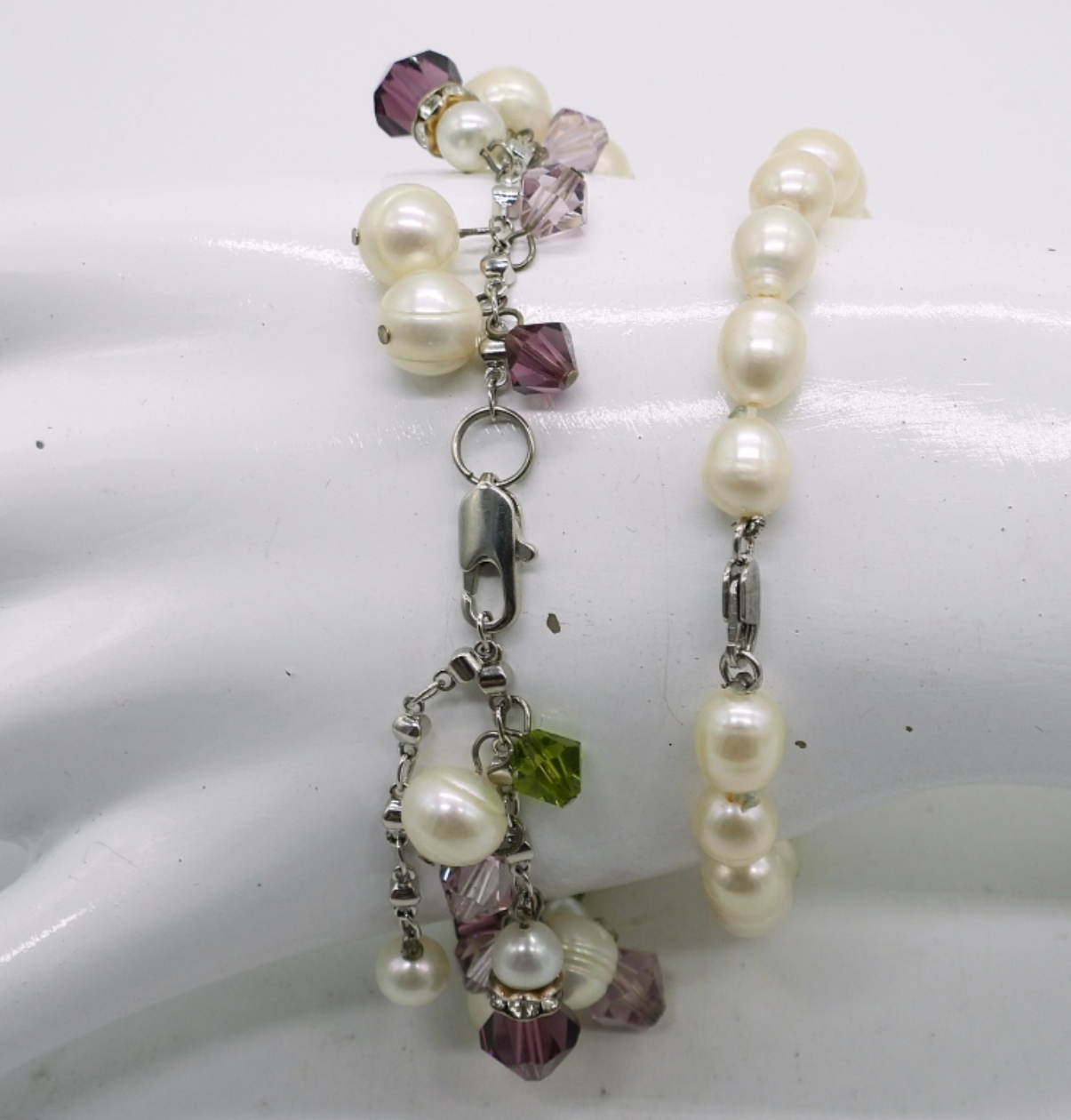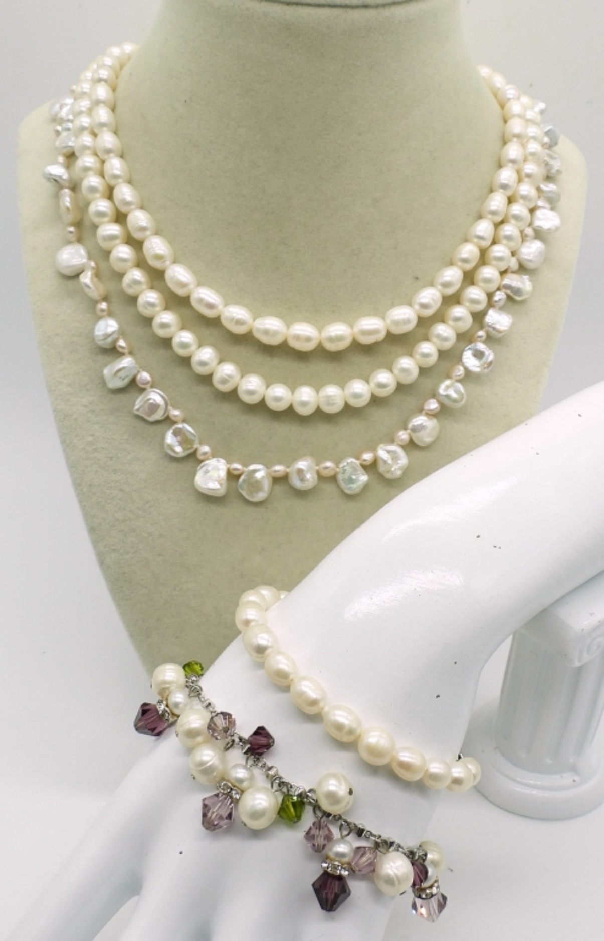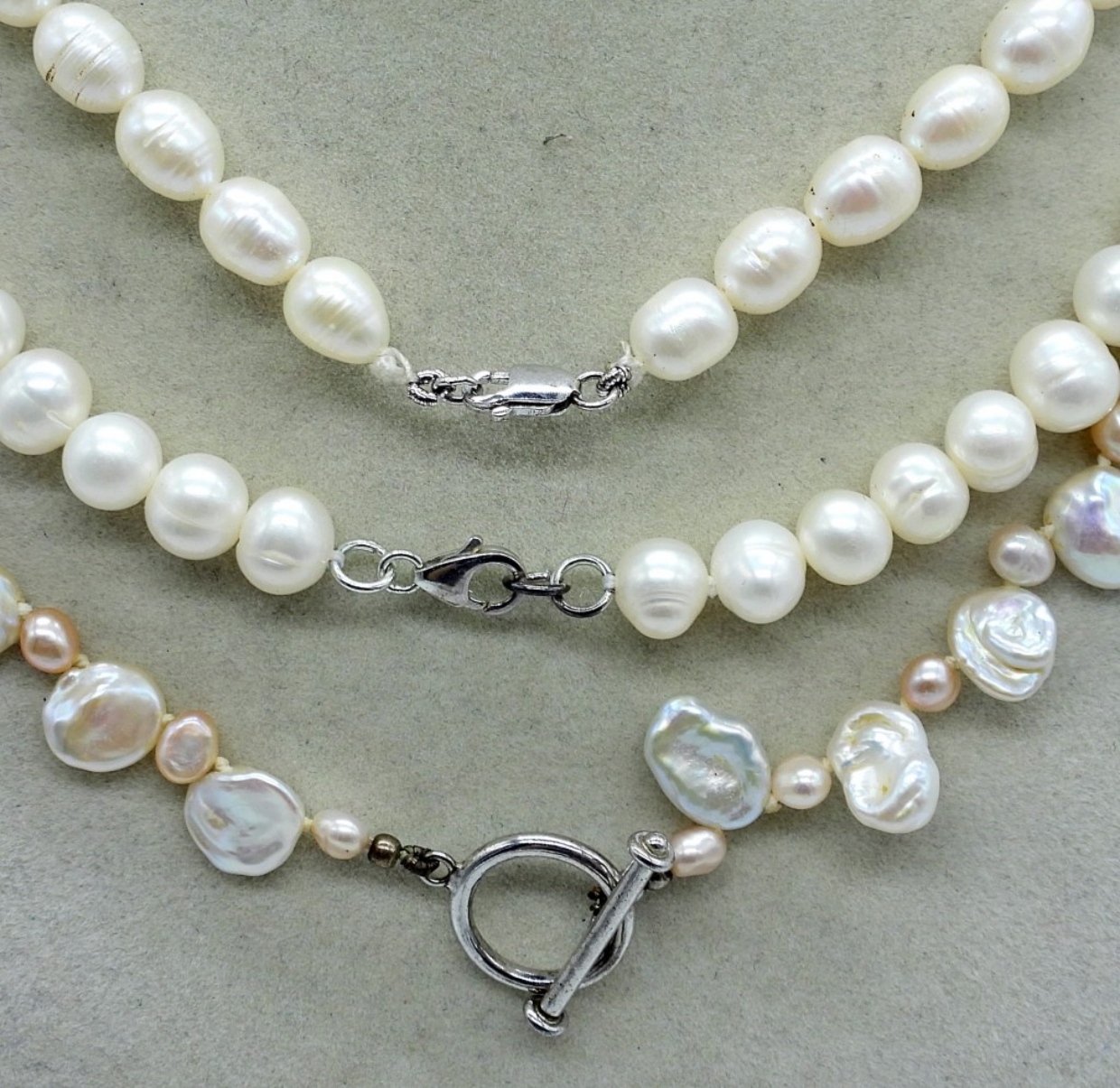 THREE NATURAL PEARL NECKLACES, 15″, 17″, 18″. TWO BRACELETS 7″ & 7-9″ADJ. VERY PRETTY!