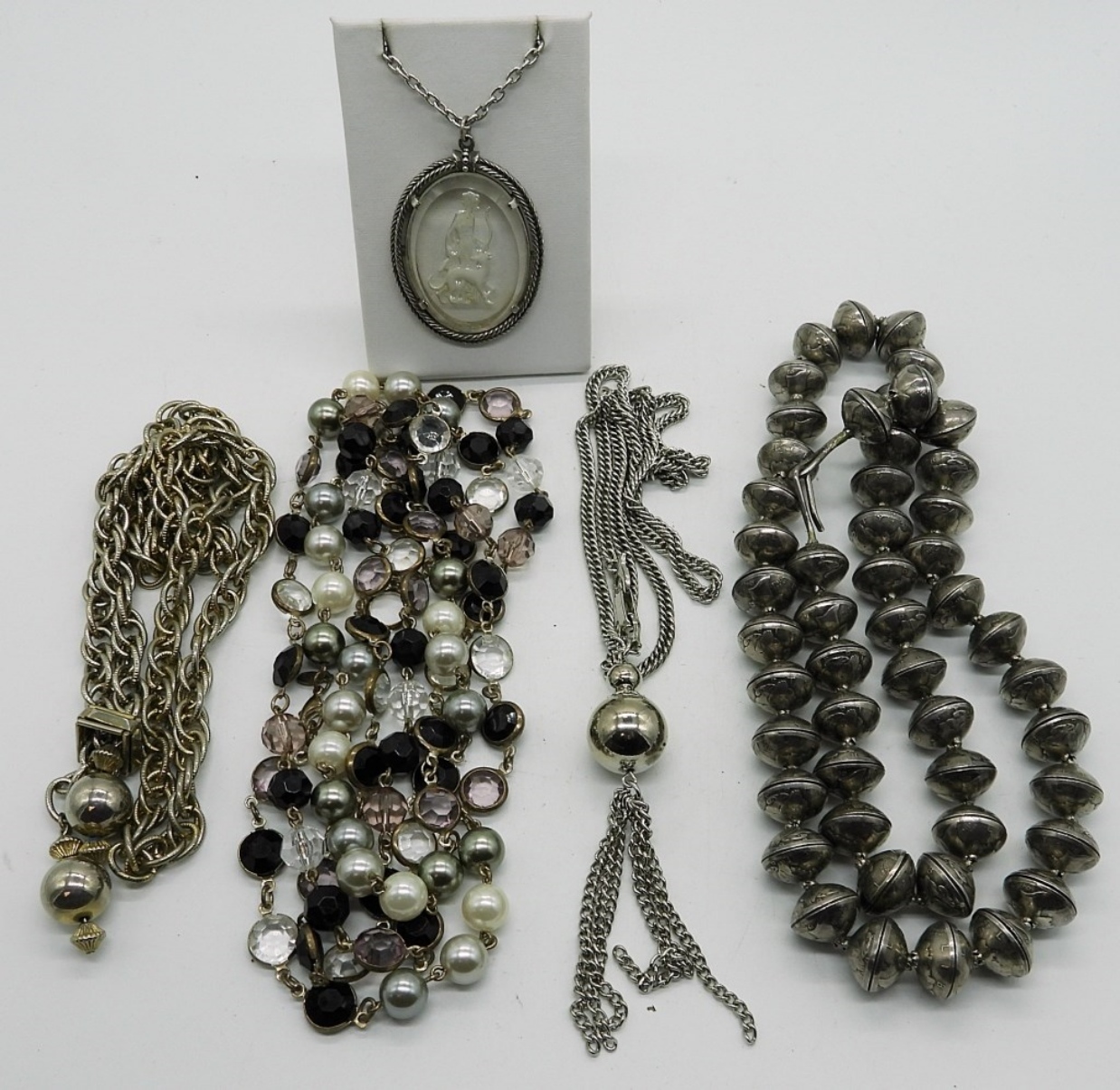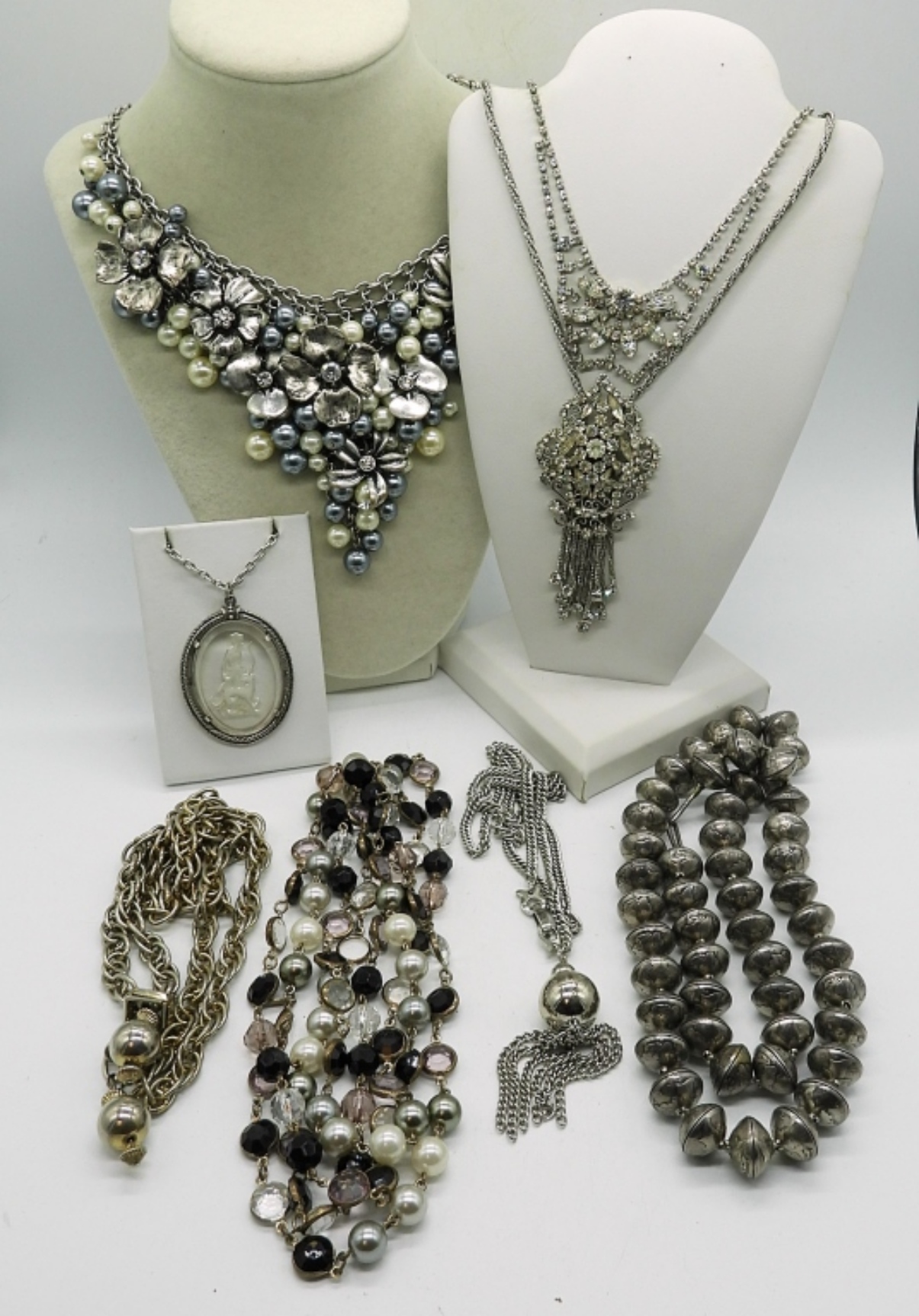 EIGHT CHUNKY FASHION NECKLACES. VINTAGE RHINESTONE, AVON GLASS CAMEO, HEAVY SILVERTONE MOLDED COIN NECKLACE. 16-48″.