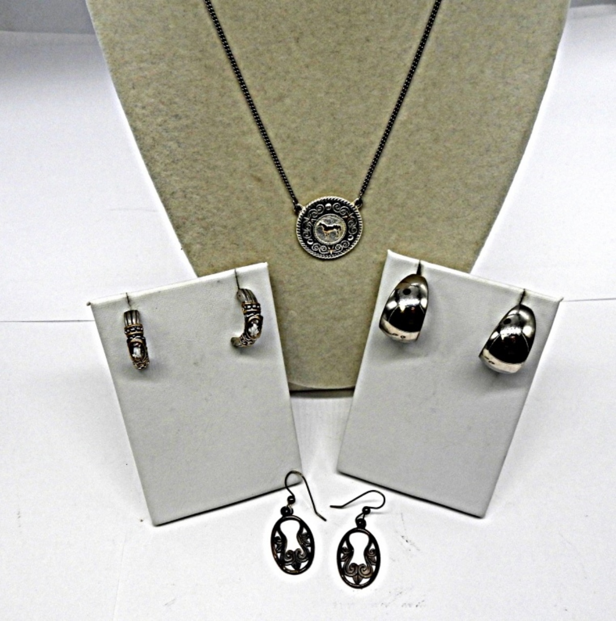 18″ NECKLACE WITH HORSE PENDANT (3) SETS OF SILVER TONE EARINGS
