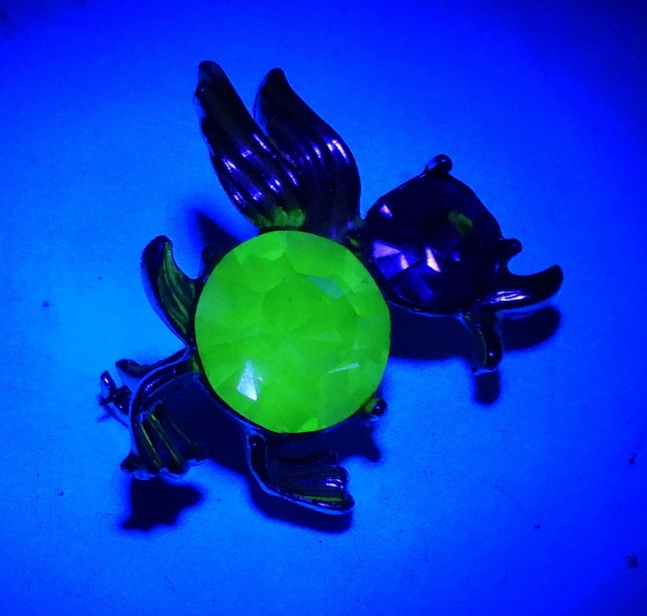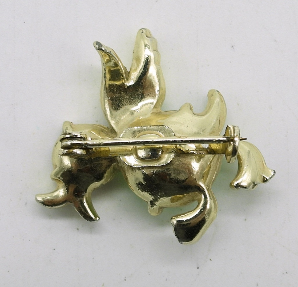 VINTAGE GOLD TONE DUCK BROOCH WITH TWO GEMSTONES. GREEN GEMSTONE IS URANIUM GLASS. 1″ PIN.