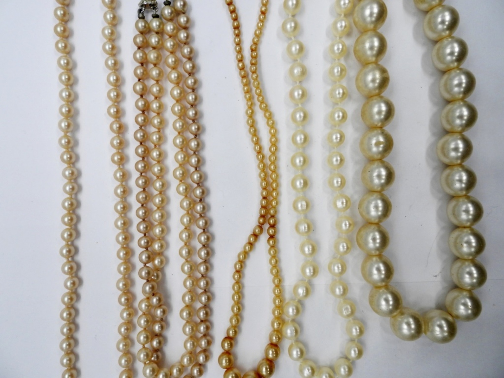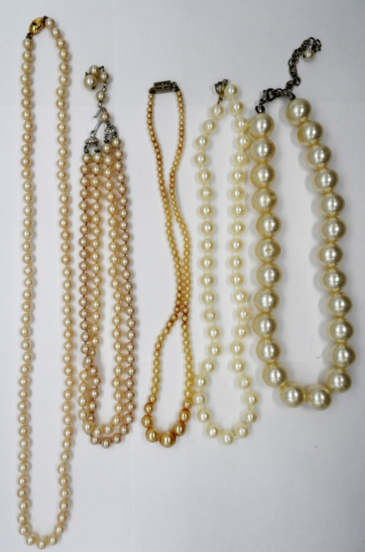 Monet Brand Strand of Pearls with Gold Tone Clasp, 23.5″. Four other strands of pearls in various sizes. 16″ &17″.
