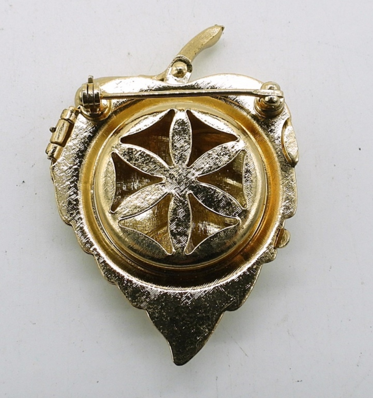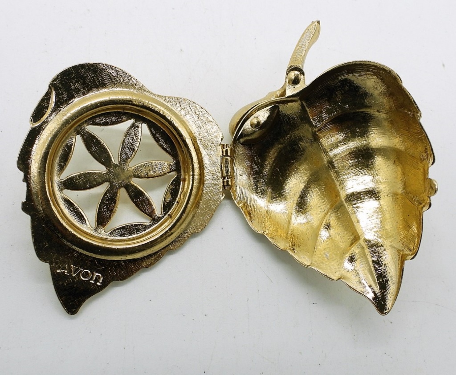 Avon Vintage Gold Tone Metal Leaf Perfume Brooch. 2 1/4″x 1.5″.