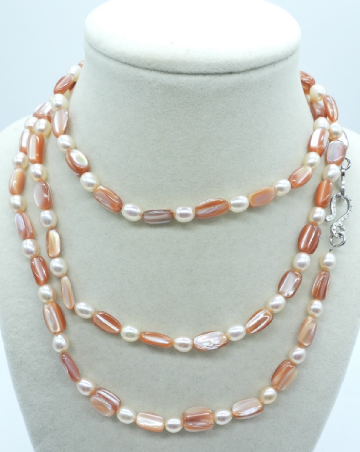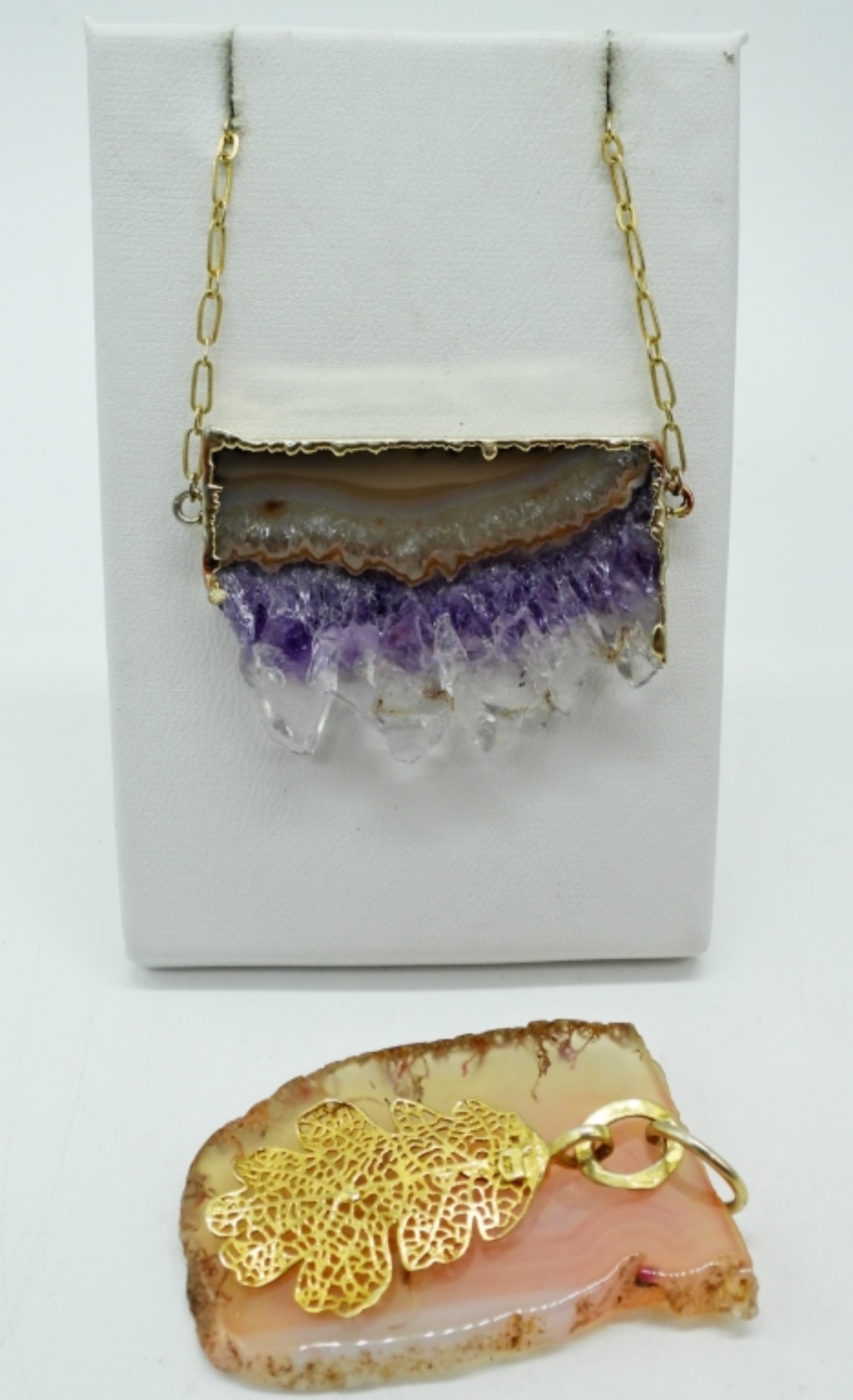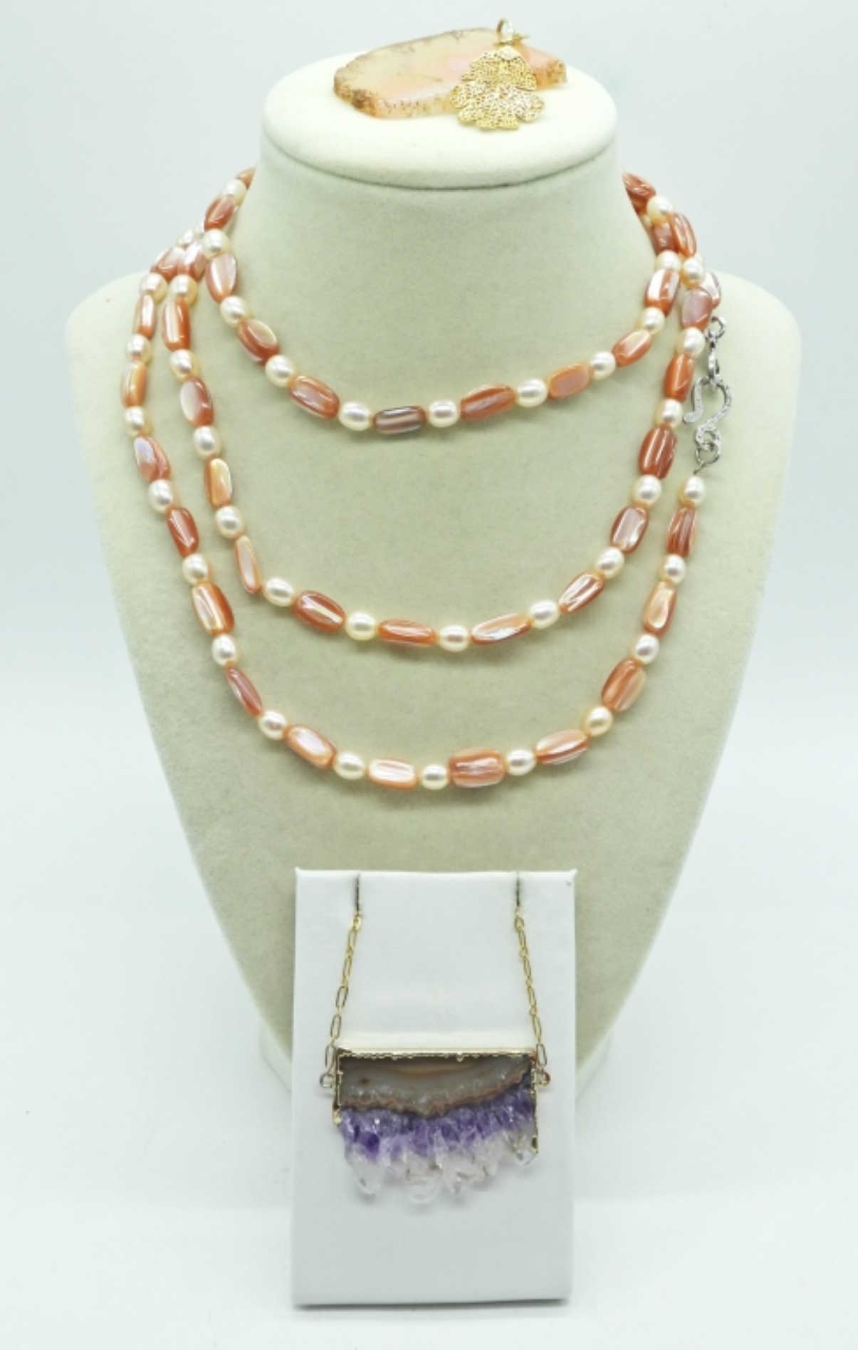 46″ Mother of Pearl & Pearl Beaded Necklace, Pink Gemstone Pendant with a gold tone leaf, 30″ Gold tone Necklace with an Amethyst Pendant.