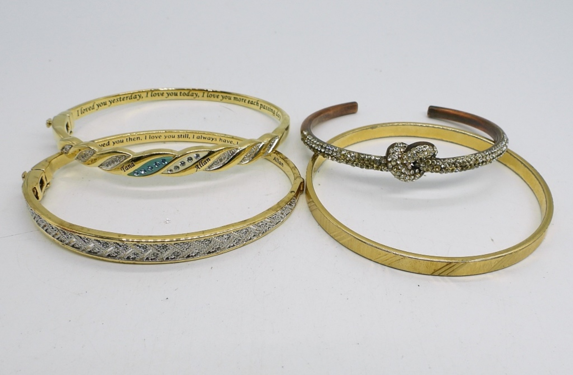 Three Gold Tone Bangle Bracelets, One Copper Colored Cuff Bracelet with Gemstones.