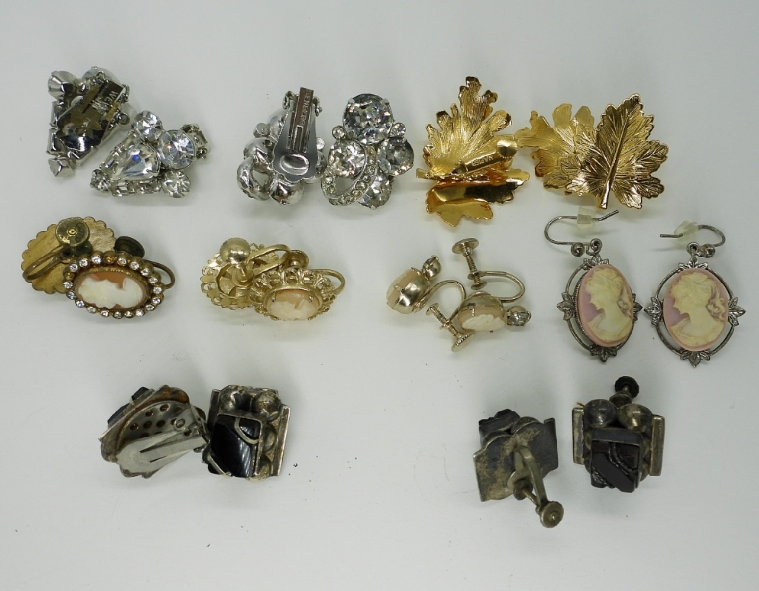 NINE PAIR OF VINTAGE EARRINGS, MOSTLY SCREW BACK, SOME PIERCED. 4 PAIR CAMEOS, 2 PAIR BLACK ONYX, 2 PAIR RHINESTONE & 1 GOLD LEAF PAIR OF NAPIER.