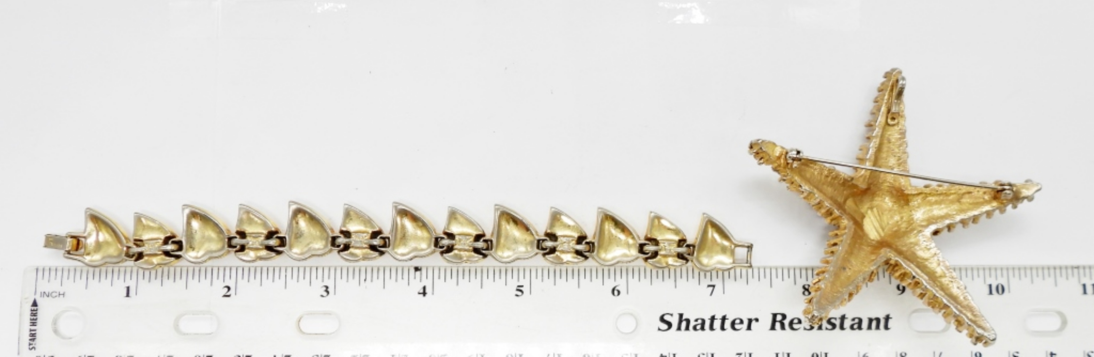 GOLD TONE SARAH COVENTRY NECKLACE WITH GEMSTONES, 24″. STARFISH BROOCH MEASURES 3″. GOLD TONE BRACELET, 7″.