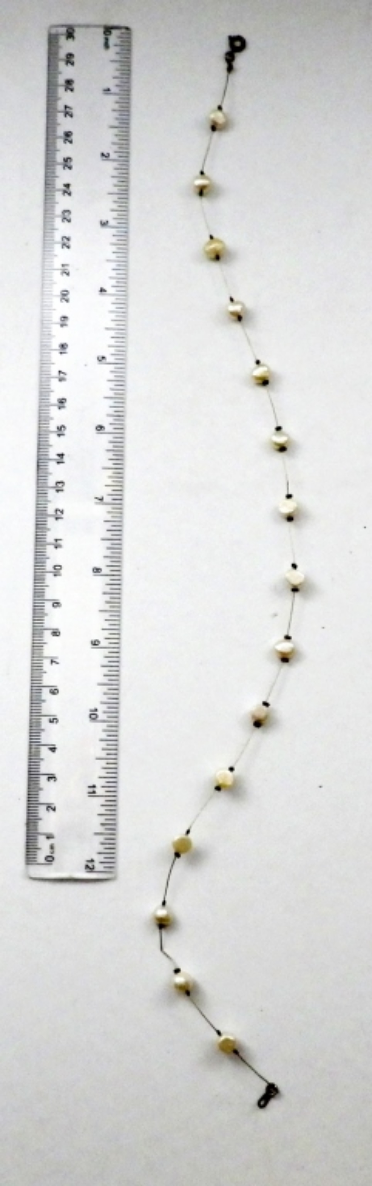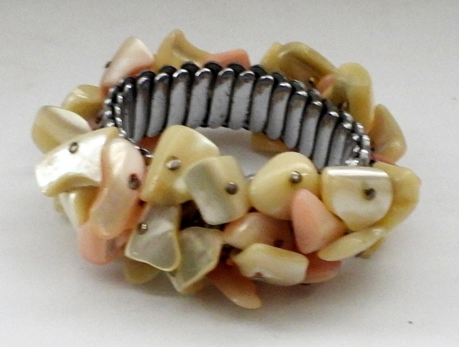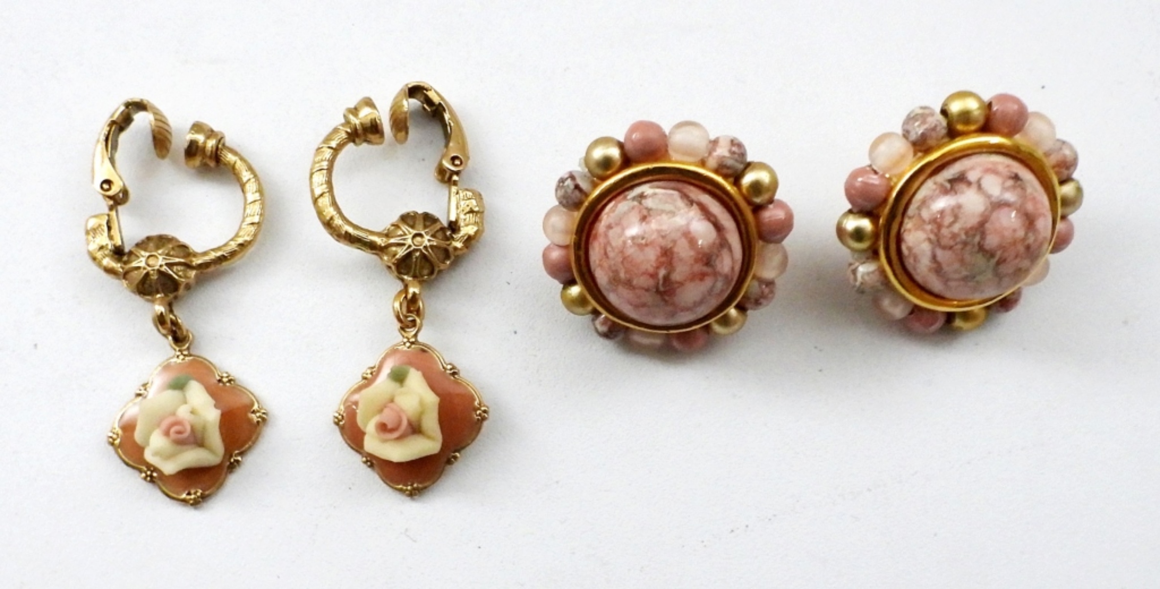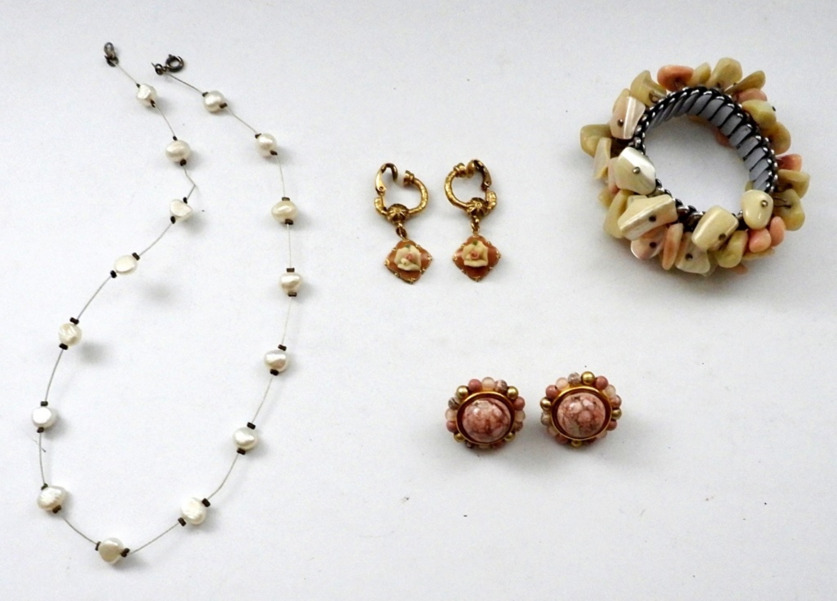 (2) PAIRS OF CLIP-ON EARRINGS WITH SMOOTH NATURAL STONES & FLOWER DESIGN, STRETCHY BRACELET WITH SMOOTH NATURAL PINK & IVORY STONES, 15″ CHOKER WITH FAUX PEARLS