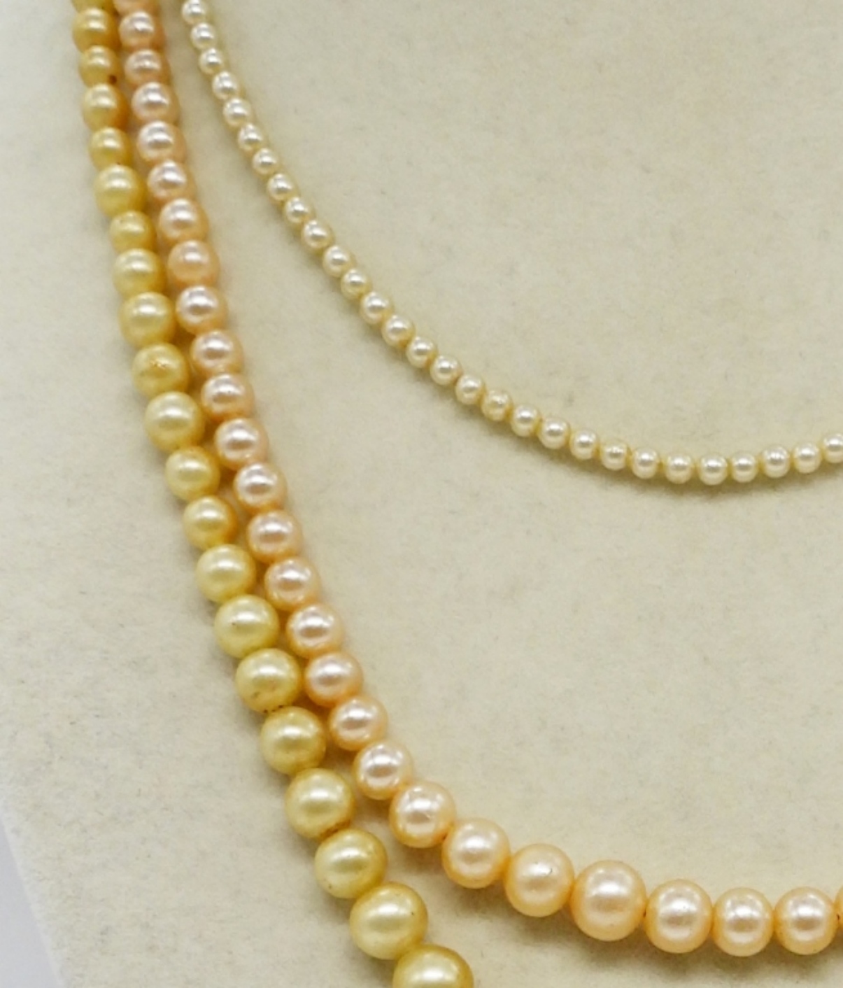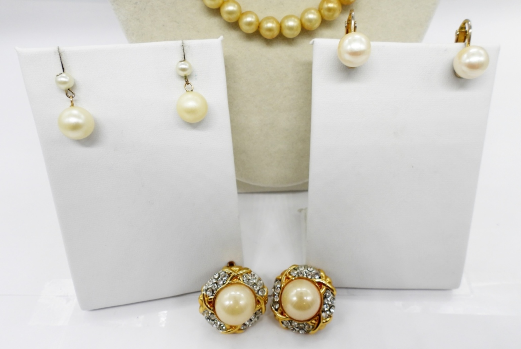 3 VINTAGE FAUX PEARL NECKLACES, 3 PAIR OF GOLD TONE FAUX PEARL EARRINGS.