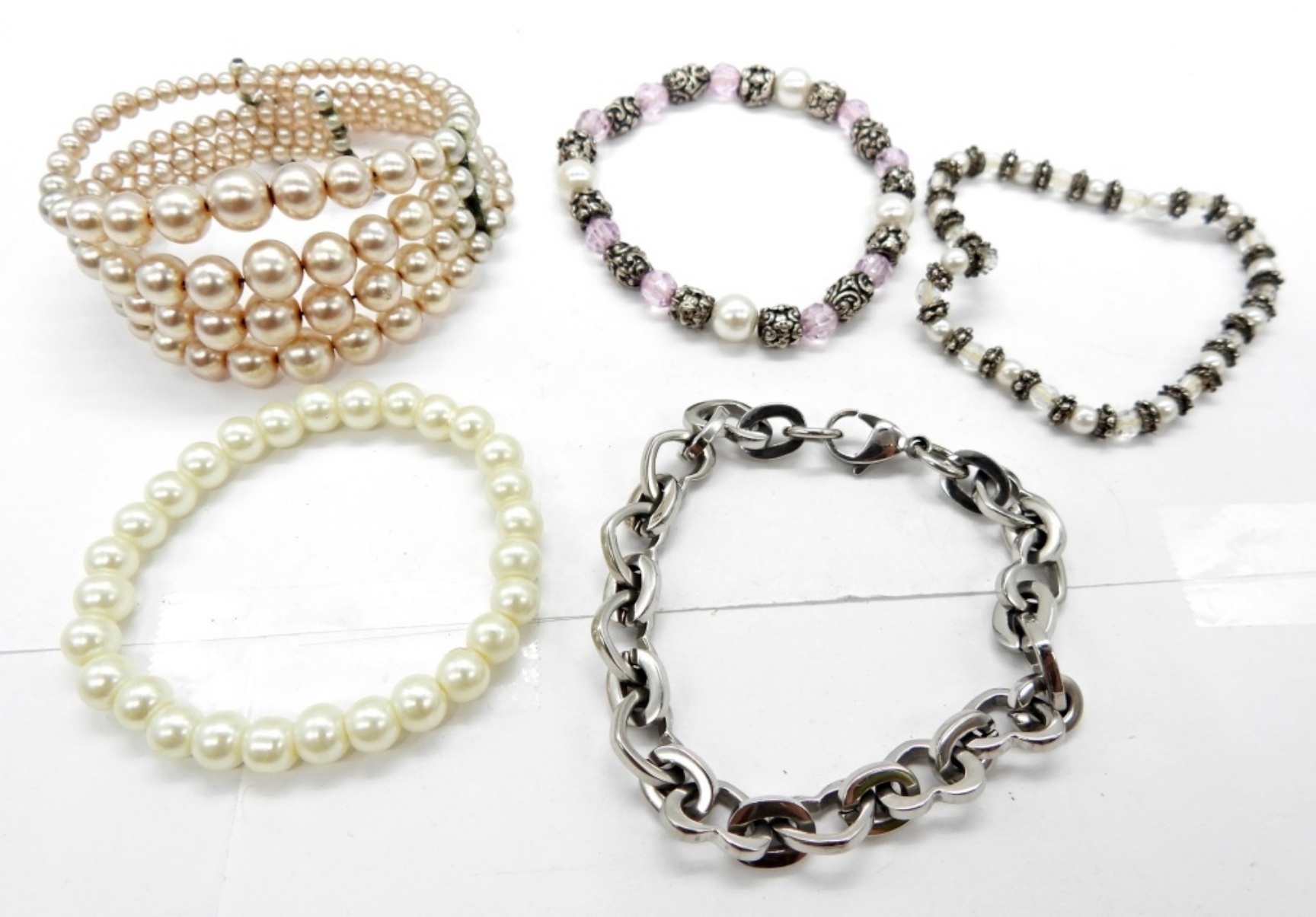 5 FASHION BRACELETS. 4 ARE FAUX PEARL STRETCHY OR ADJUSTABLE AND ONE SILVER TONE HEART LINK BRACELET, 7.5″.