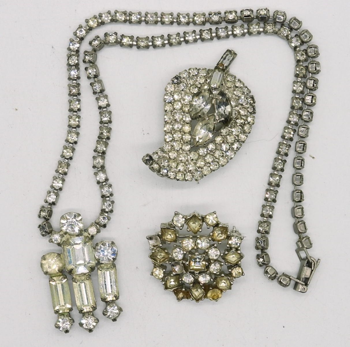 Vintage Silver Tone 15″ Rhinestone Necklace, Two Vintage Rhinestone Brooches (Some missing stones, See Photos!).