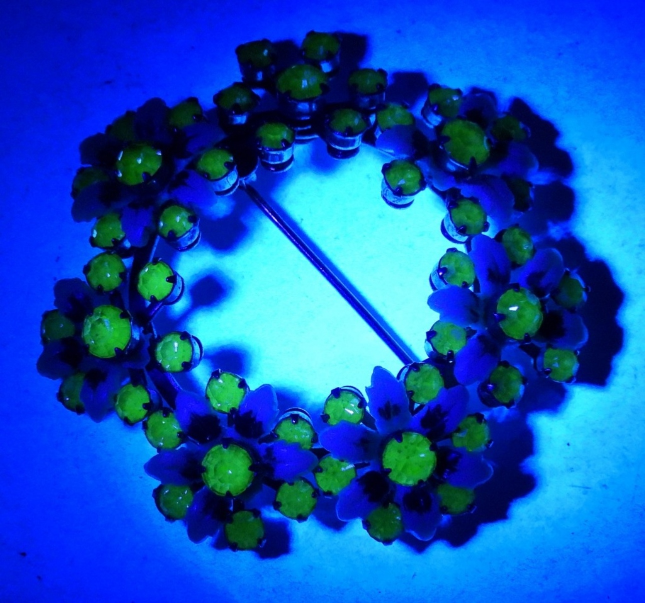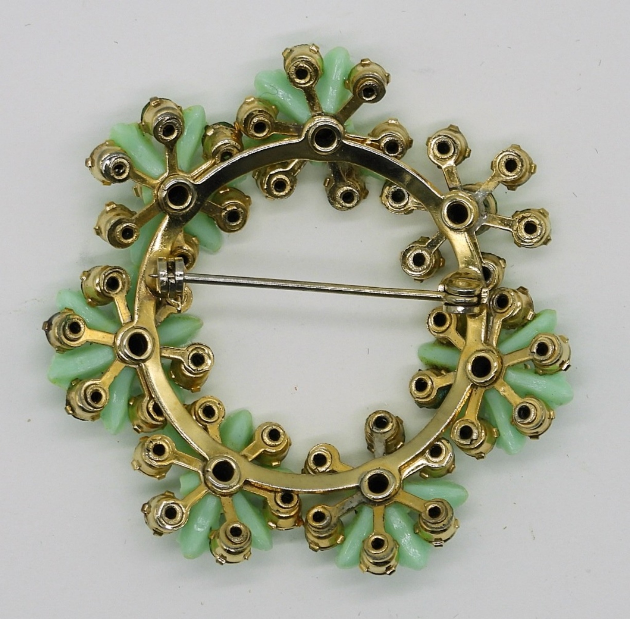 GREEN FLORAL BROOCH (MANY FLOWERS ARE BROKEN) WITH LIGHT GREEN URANIUM GLASS GEMSTONES. 2″. SEE PHOTOS