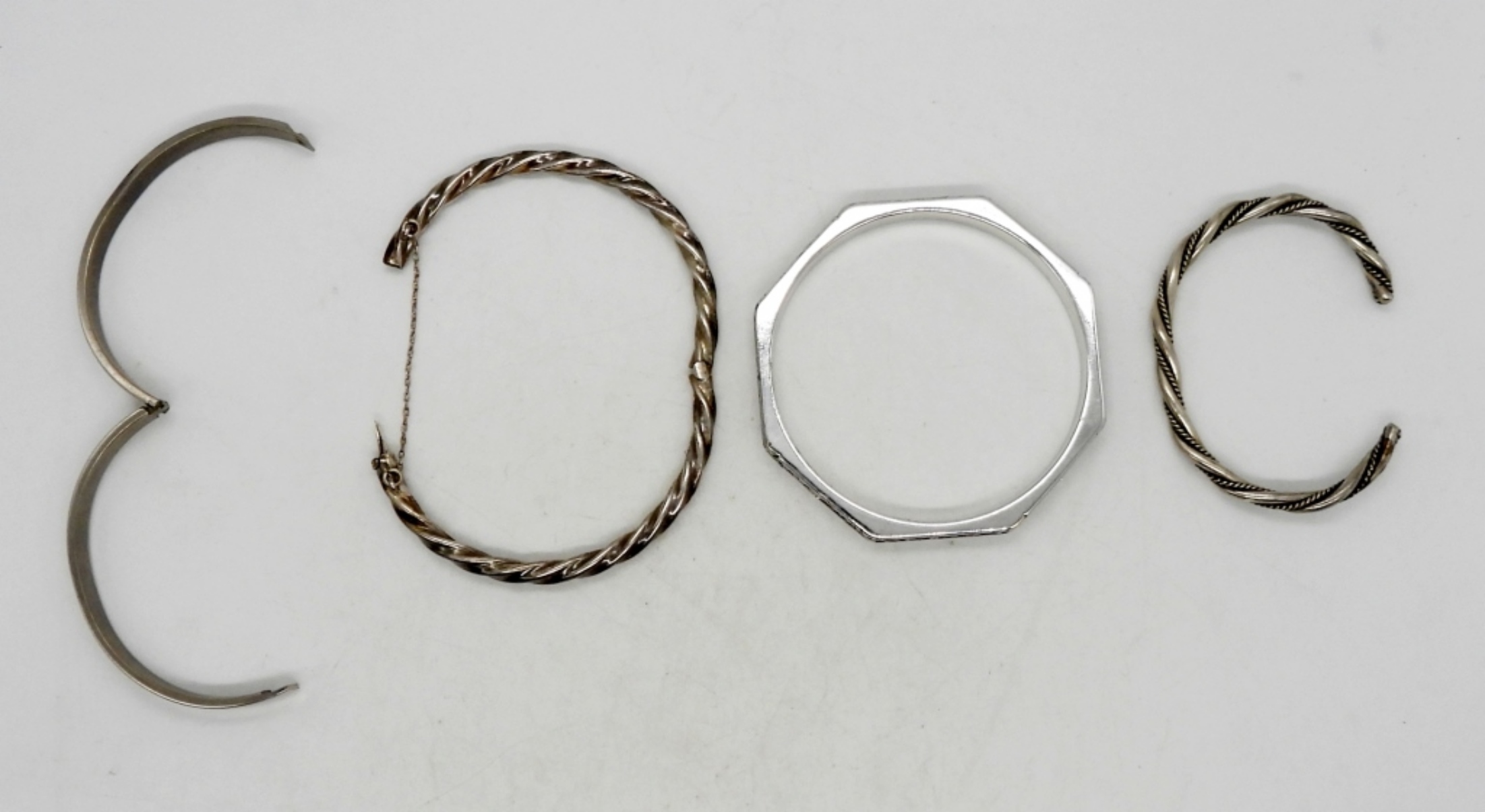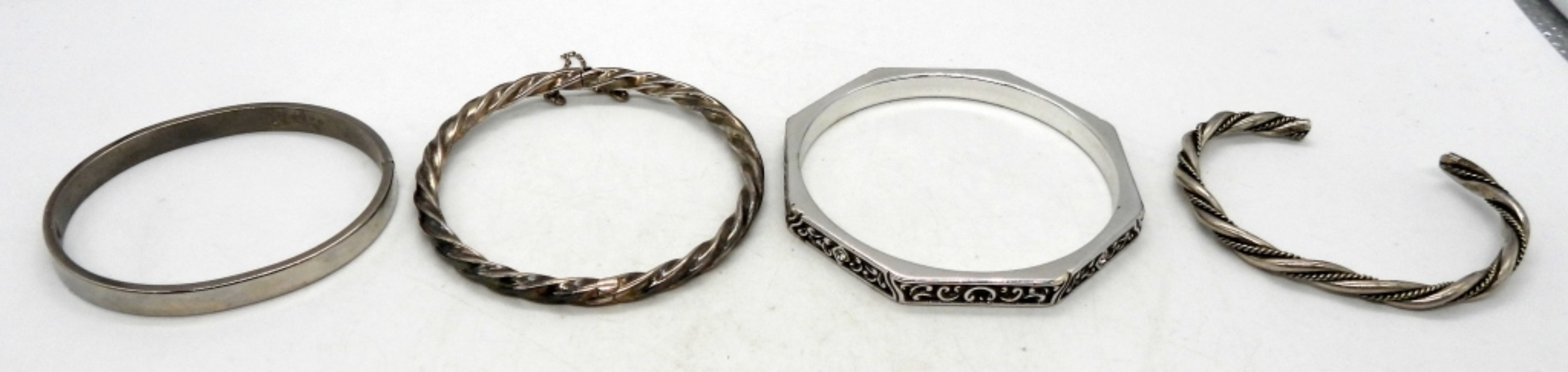 (1) 2.5″ OCTAGONAL BANGLE W/ FILIGREE & RHINESTONE DETAIL, (1) 2.5″ TWISTED HINGE, (1) 2″ OVAL HINGE, & (1) 2″ TWISTED CUFF