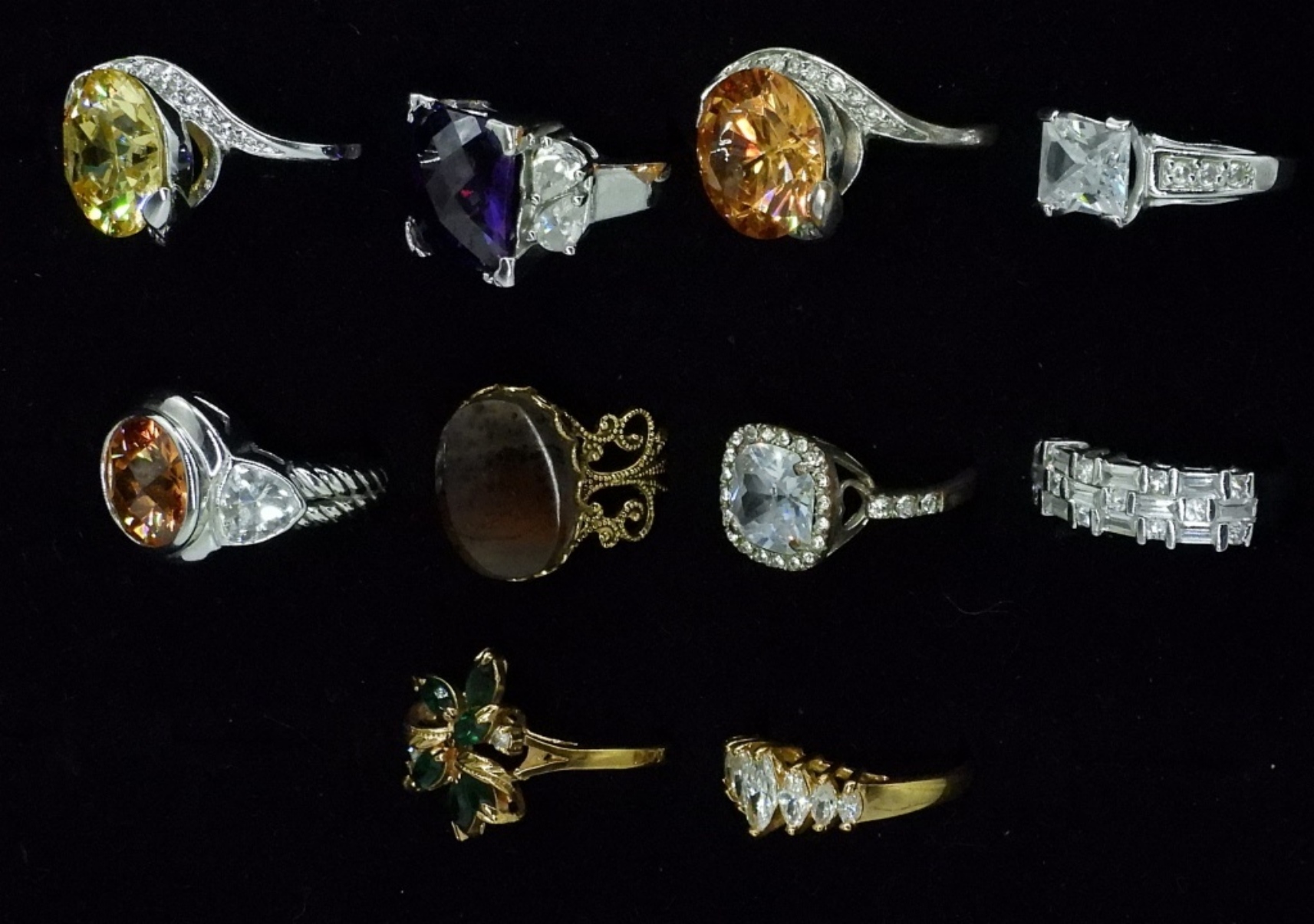 TEN VERY BEAUTIFUL GOLD AND SILVER TONE GEMSTONE FASHION RINGS. SIZES 8-10