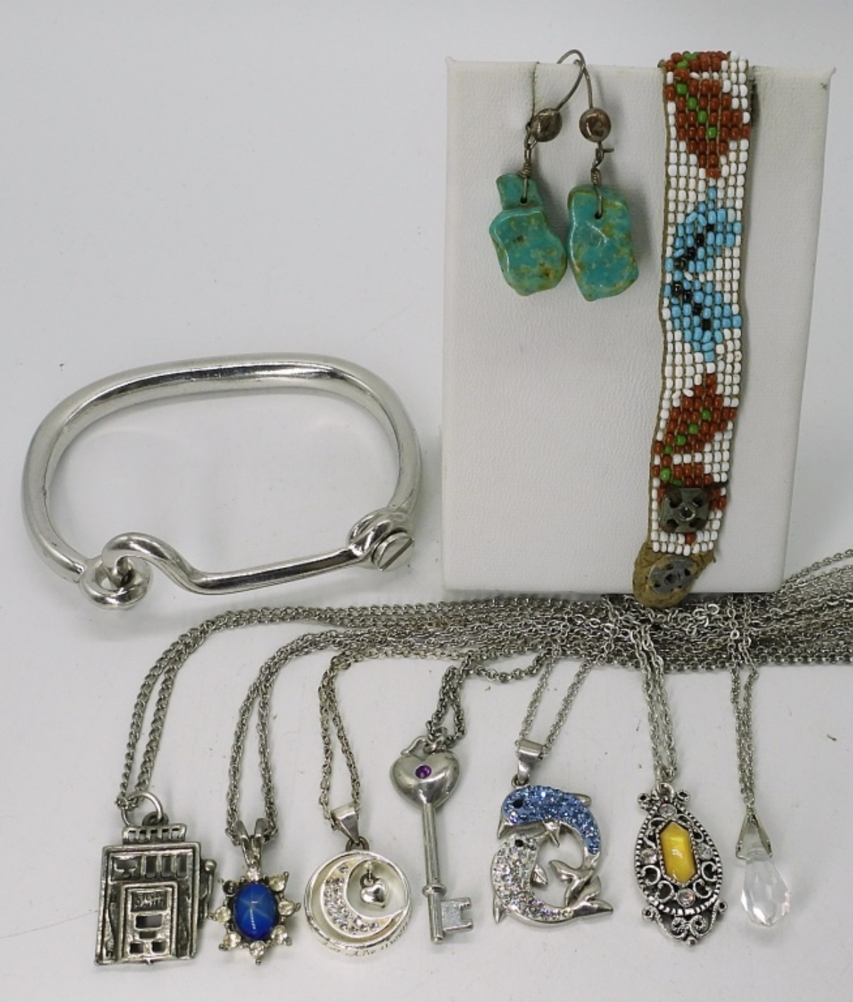 7 SILVERTONE NECKLACES WITH CHARMS, 14-24″ CHAINS. THE COOLEST HOOK BRACELET YOU’LL EVER SEE! A BEADED & LEATHER BRACELET, 6″. TURQUOISE EARRINGS.