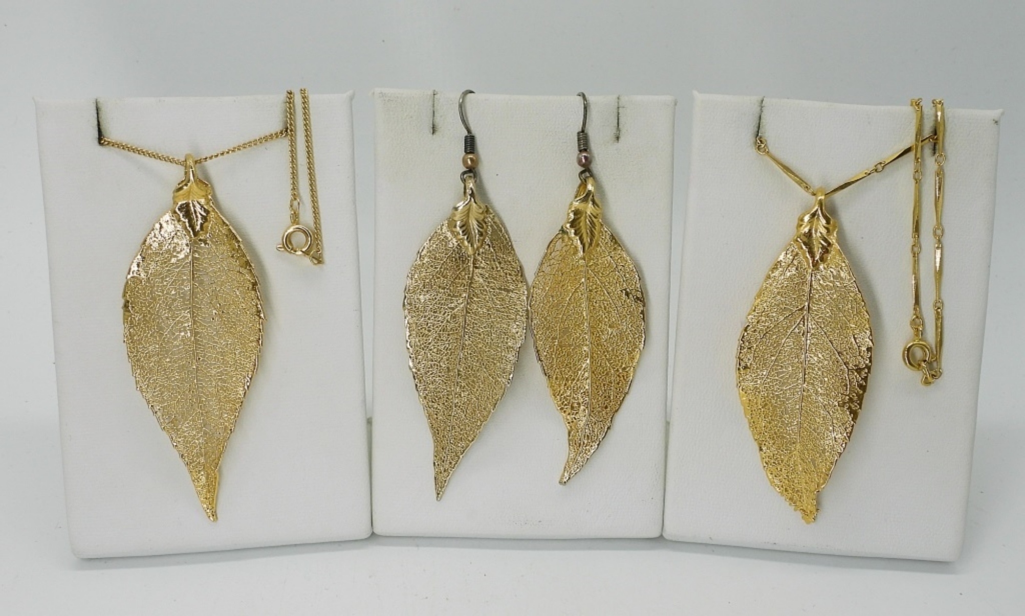 TWO GOLD PLATED EUCALYPTUS LEAF NECKLACES ON GOLD TONE CHAINS, 16 & 18″. ONE PAIR MATCHING PIERCED EARRINGS.