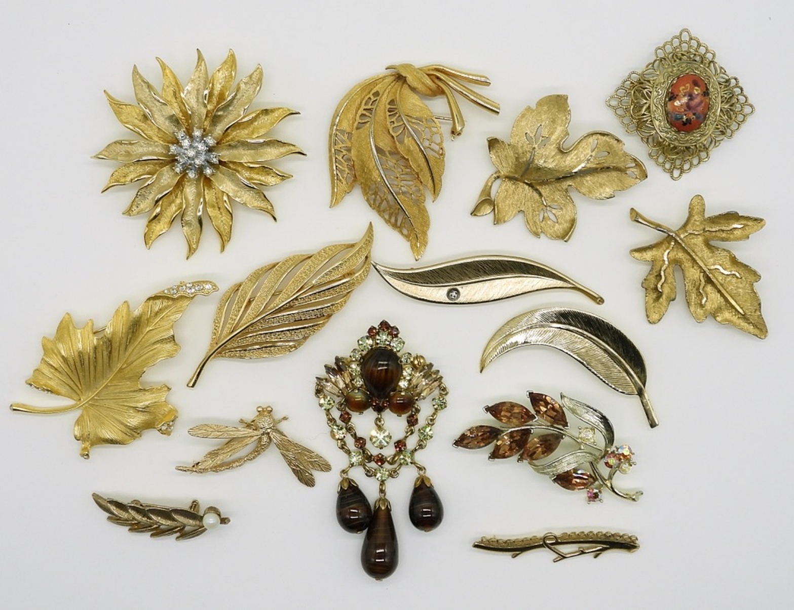 FOURTEEN GOLD TONE BROOCHES IN NATURE DESIGNS.