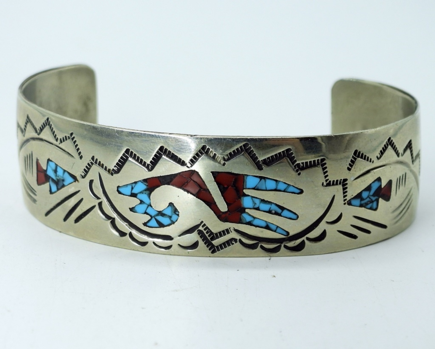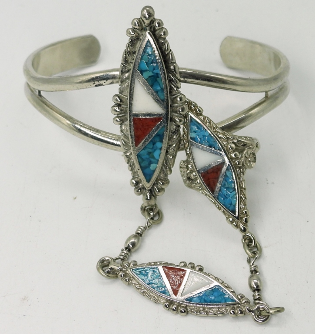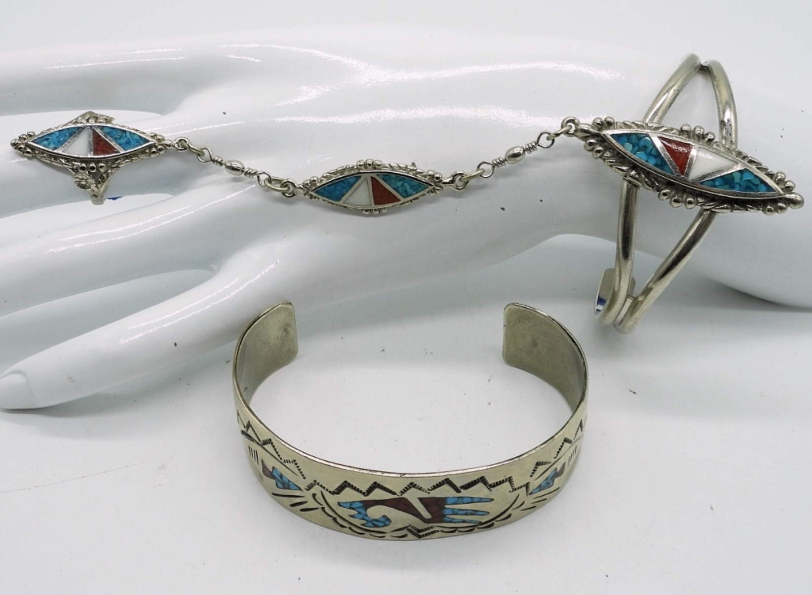 TWO SOUTHWEST STYLE BRACELETS IN SILVERTONE, ONE HAS AN ATTACHED RING (6.5). BRACELETS ARE 5.5″ CUFF STYLE.