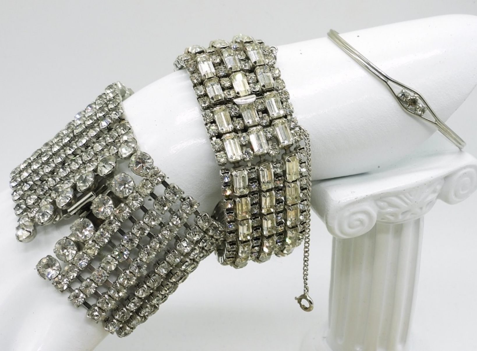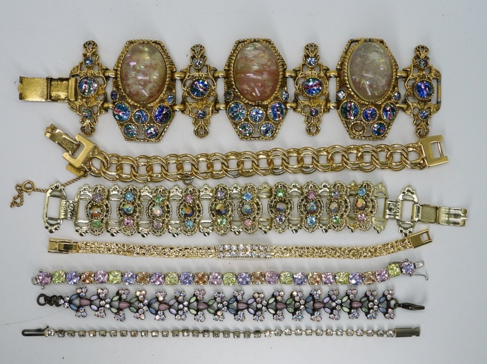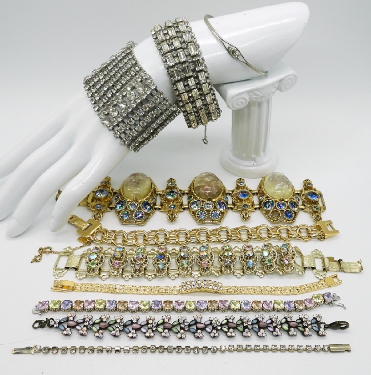 TEN GOLD AND SILVER TONE BRACELETS WITH VARIOUS COLORS OF RHINESTONES, 7″ & 5″.