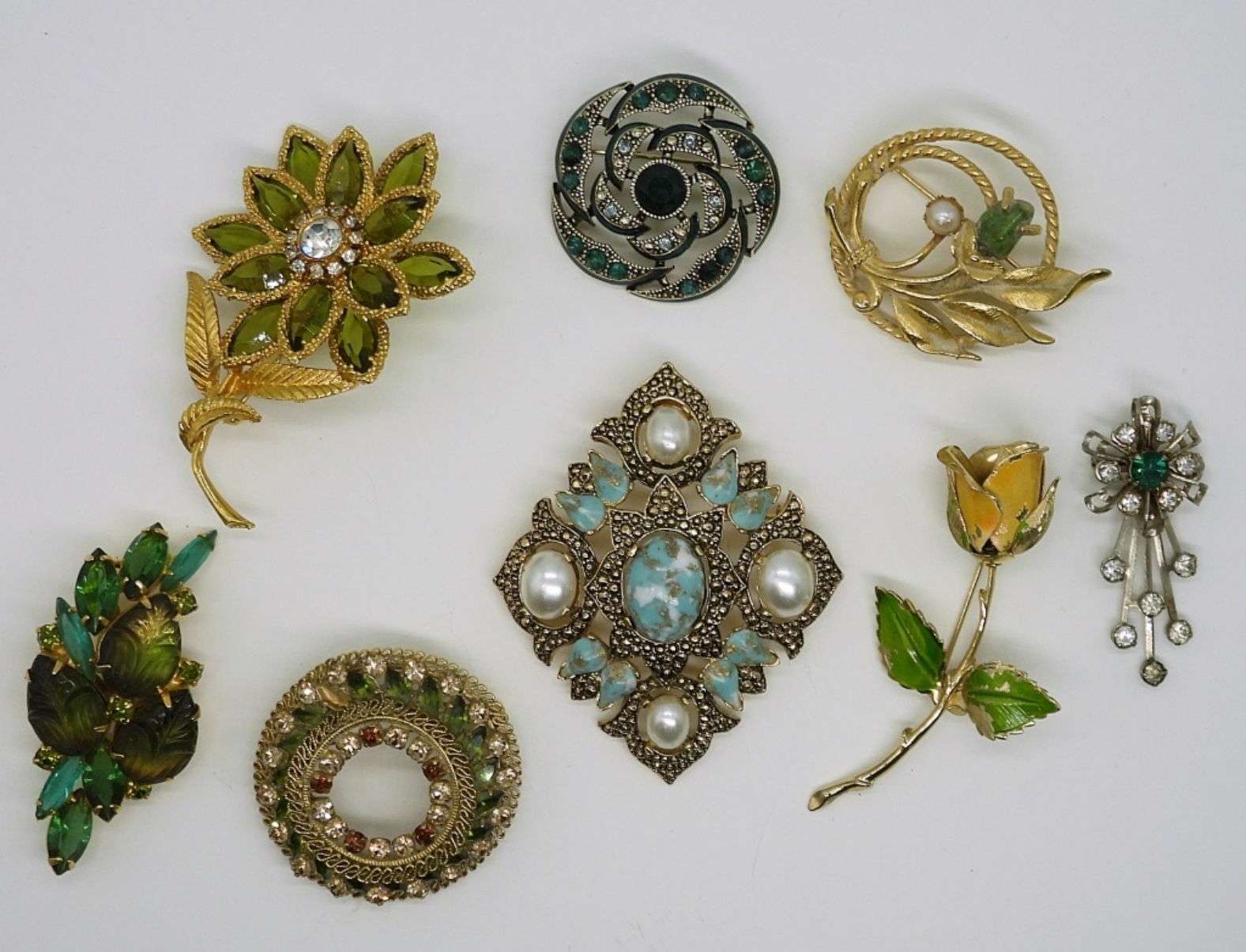 EIGHT VINTAGE GOLD AND SILVER TONE BROOCHES WITH GREEN AND BLUE GEMSTONES/RHINESTONES.