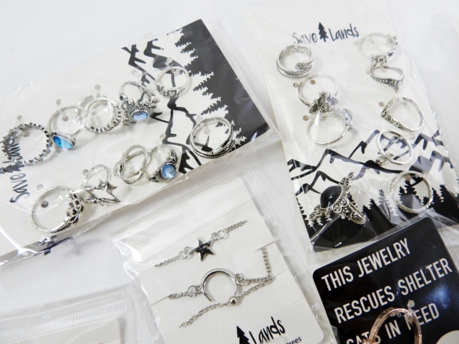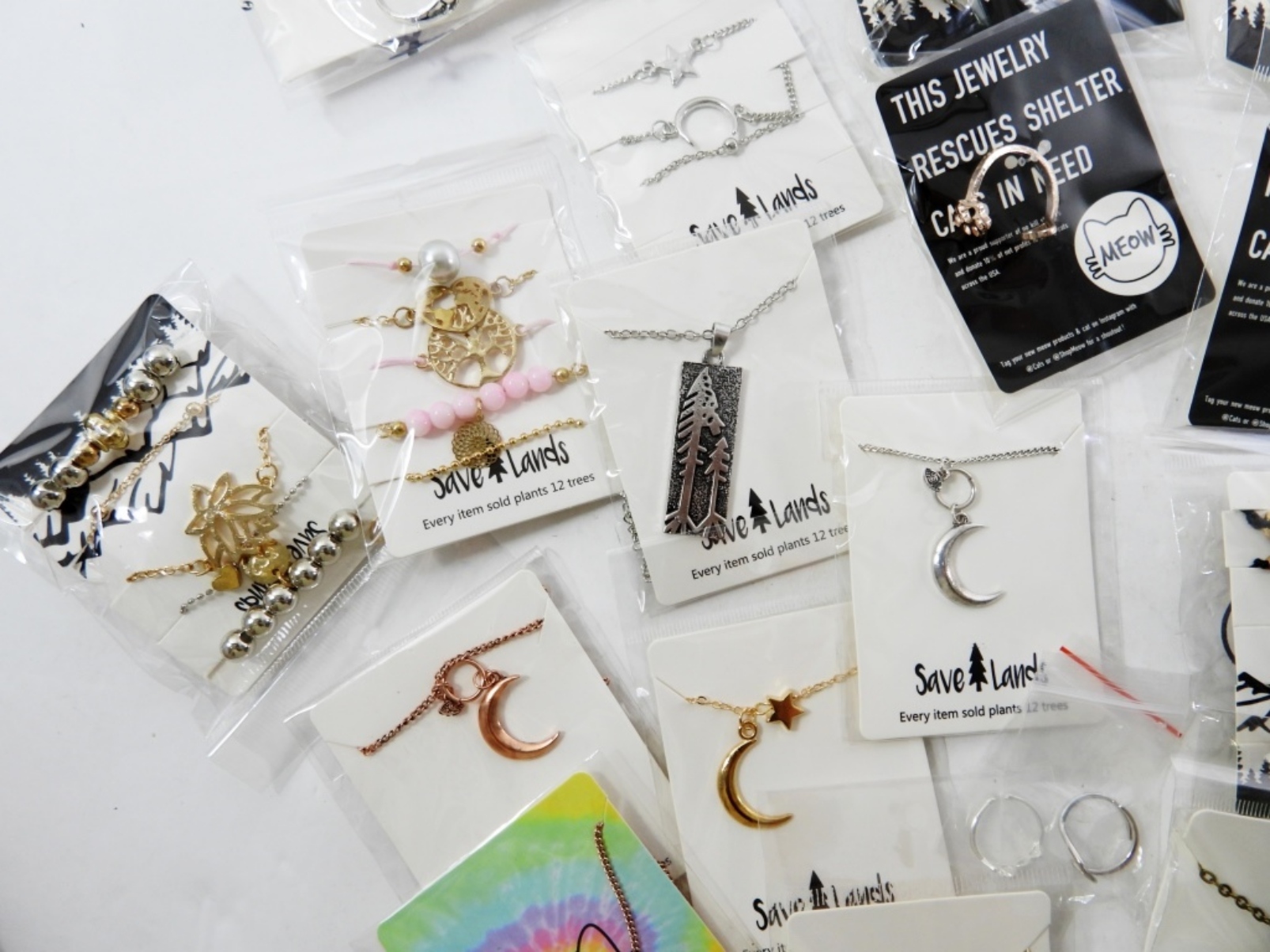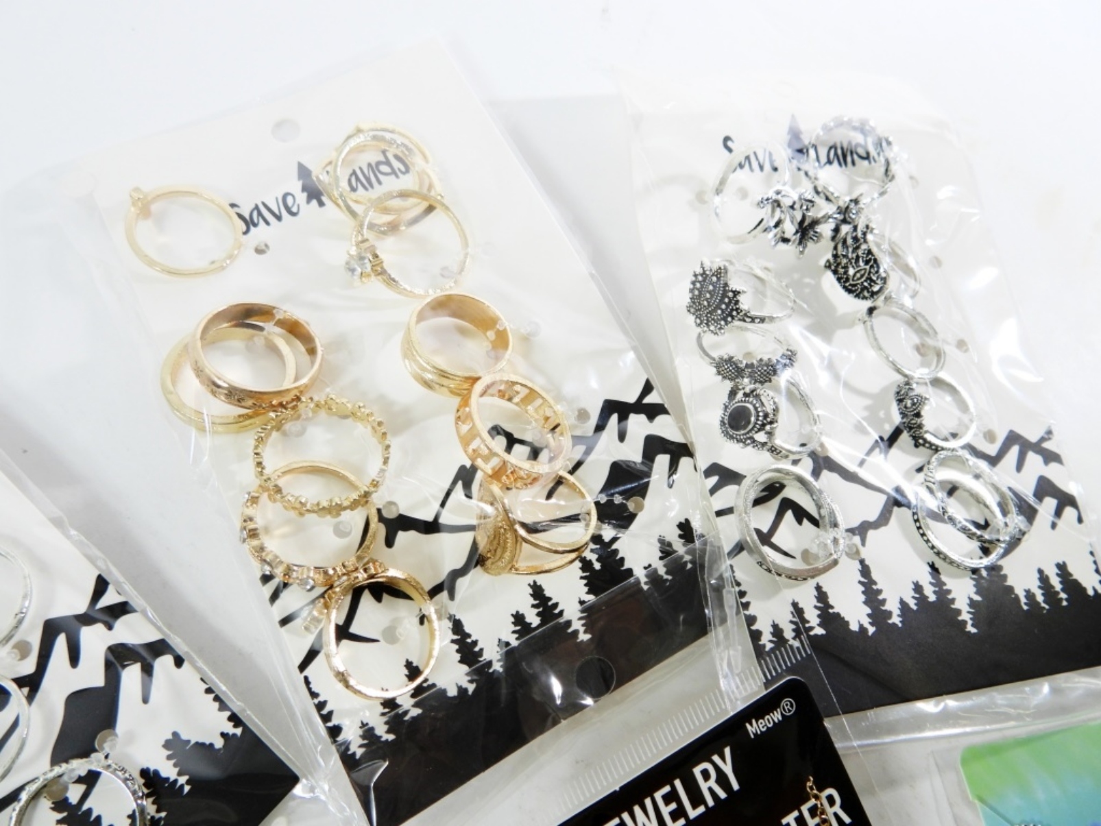 GOLD AND SILVER TONE BRAND NEW COSTUME JEWELRY. RINGS, NECKLACES, BRACELETS. RINGS ARE VARIOUS SIZES PER PACKAGE.