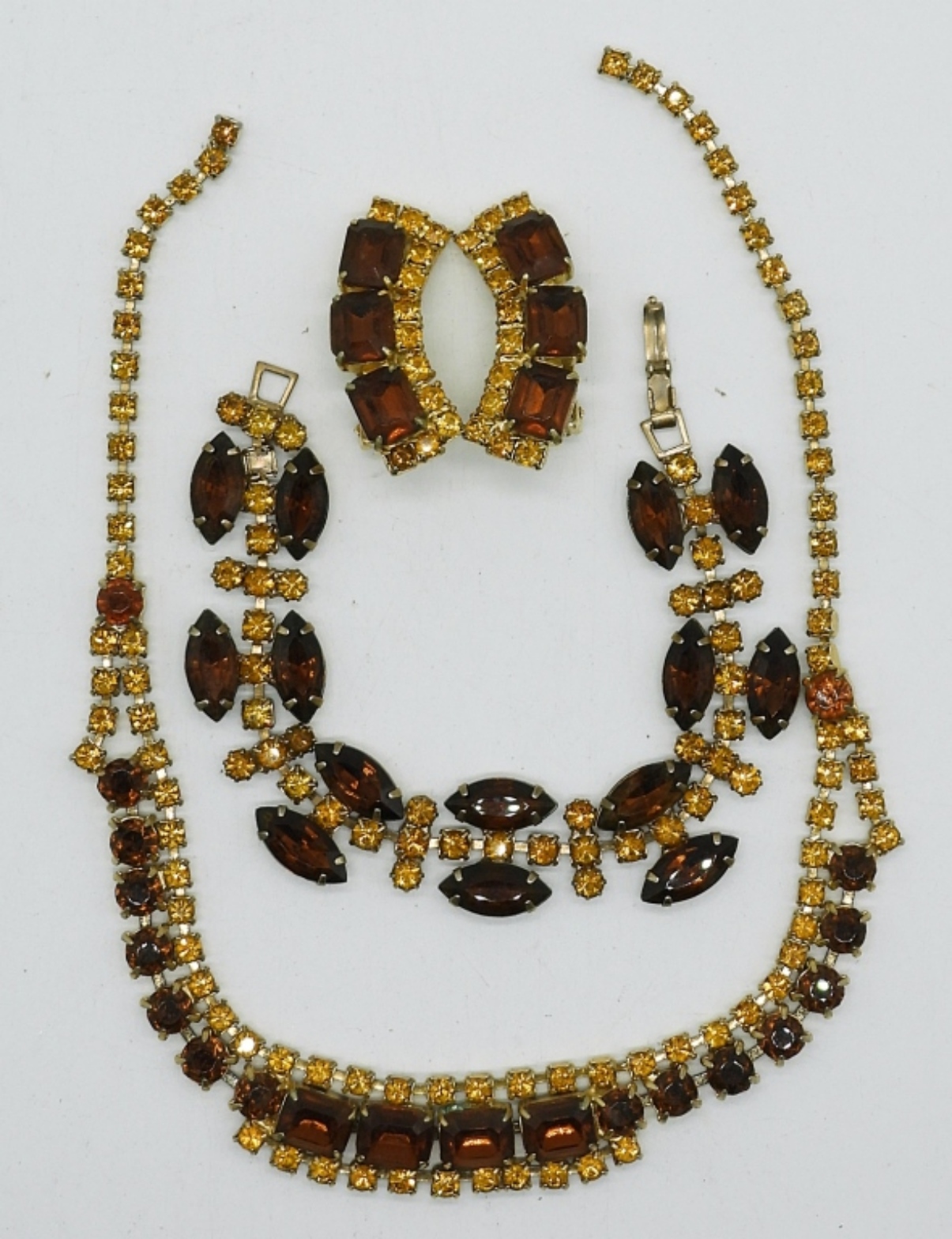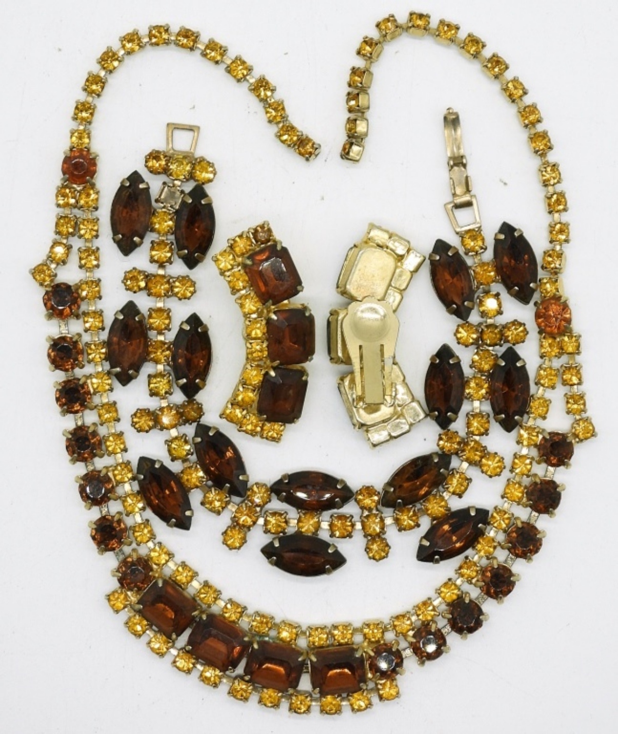 GORGEOUS VINTAGE BROWN & YELLOW RHINESTONE SET. NECKLACE (HAS NO CLASPS) 13.5″. MATCHING BRACELET, 7″. MATCHING CLIP-ON EARRINGS.