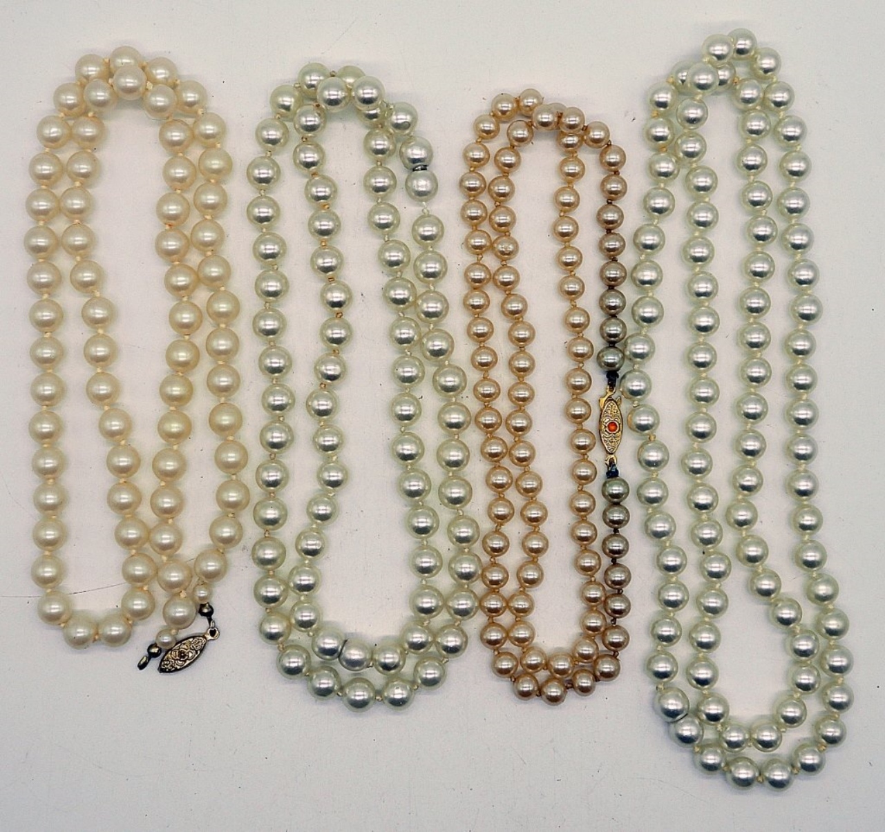 FOUR STRANDS OF PRETTY PEARLS, PROBABLY FAUX PEARLS. ONE HAS A BROKEN CLASP. ONE HAS A HIDDEN CLASP. 22-28″.
