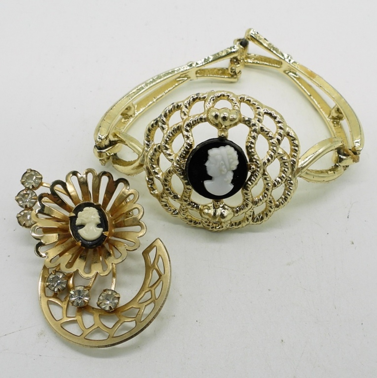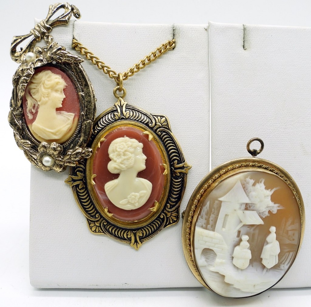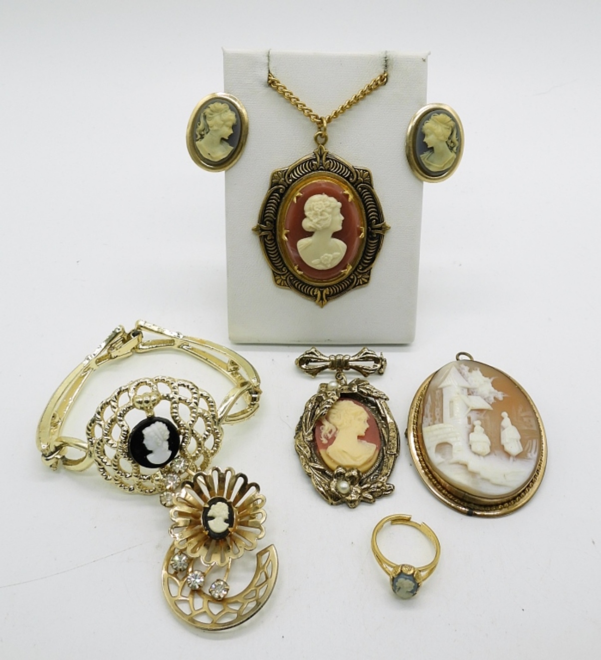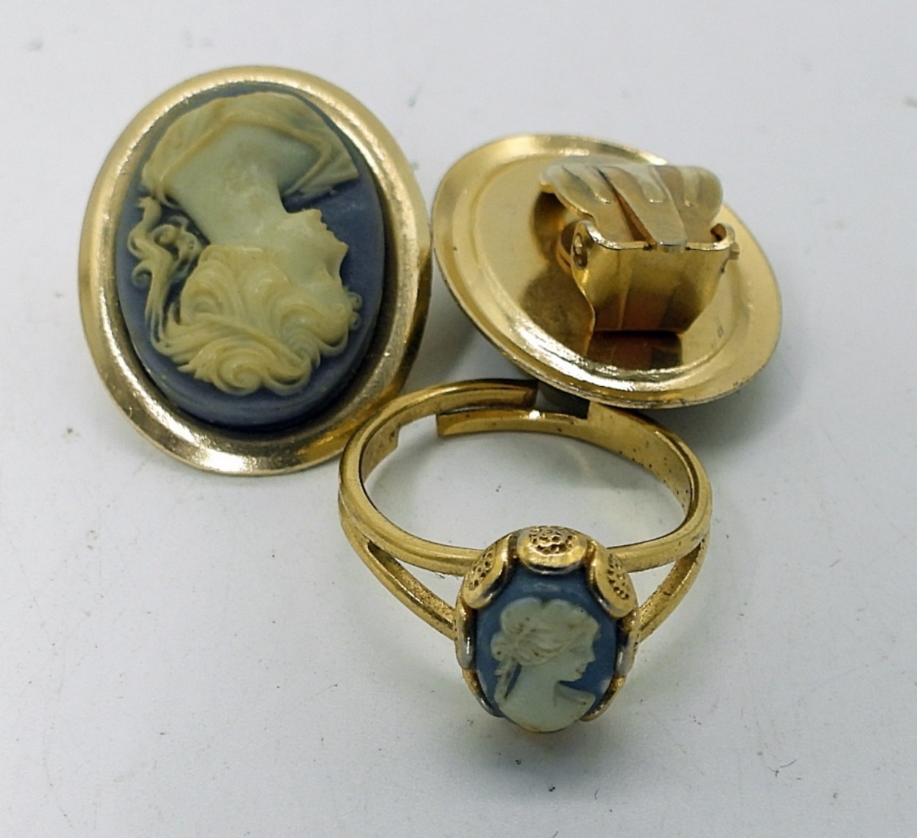 BLUE CAMEO CLIP ON EARRINGS WITH MATCHING ADJUSTABLE RING IN GOLD TONE. CAMEO NECKLACE, 16″. TWO CAMEO BROOCHES, ONE LARGE CAMEO BROOCH/PENDANT 2″x1.5″. ONE GOLD TONE PLASTIC CAMEO BRACELET.