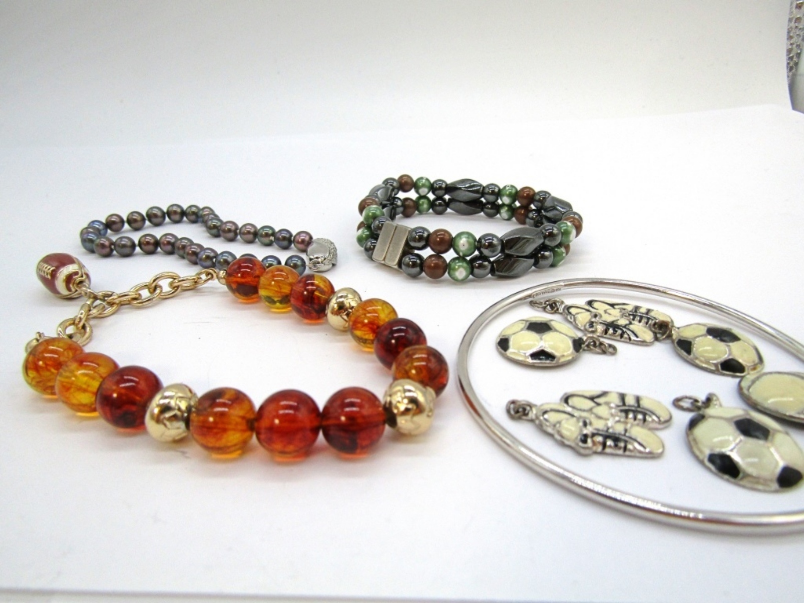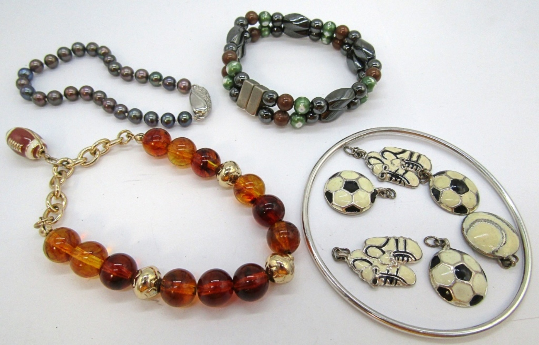 FOOTBALL BRACELET, 7″. THREE OTHER BRACELETS, 7″. 6 SPORTS PENDANTS.