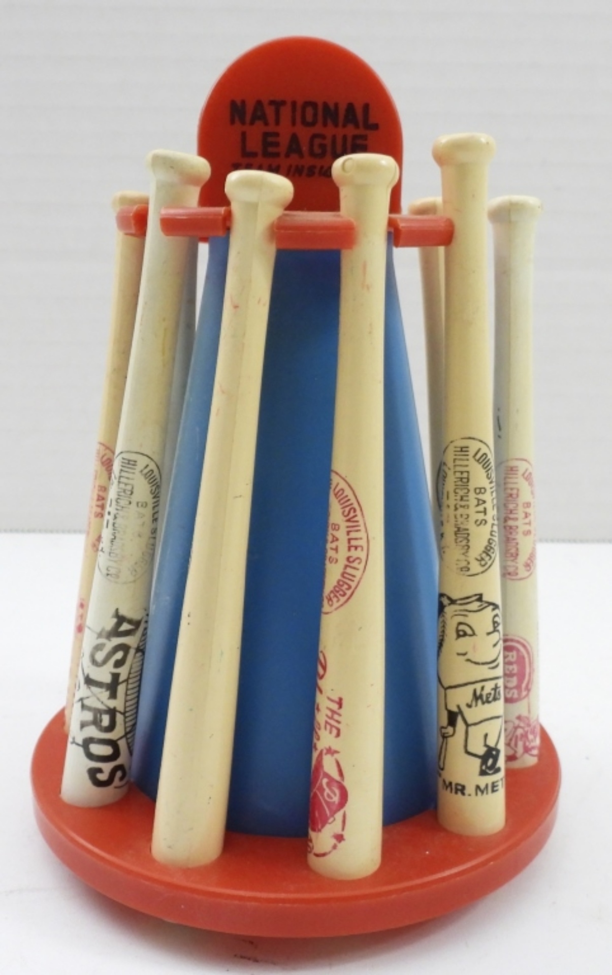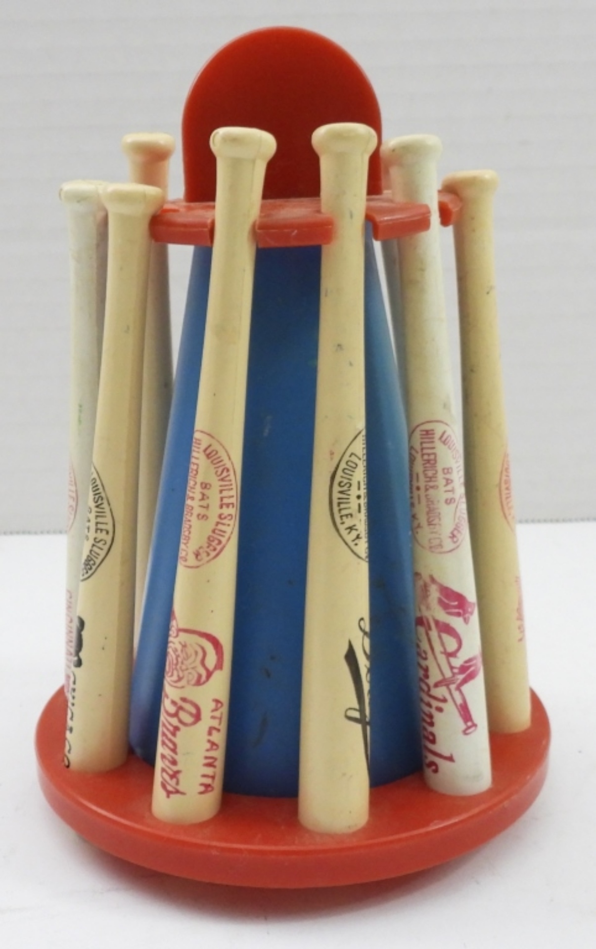 PLASTIC BAT HOLDER BANK with (10) MINI PLASTIC BATS – LOOKS LIKE TOP HAS BEEN GLUED IN SMALL SPOT